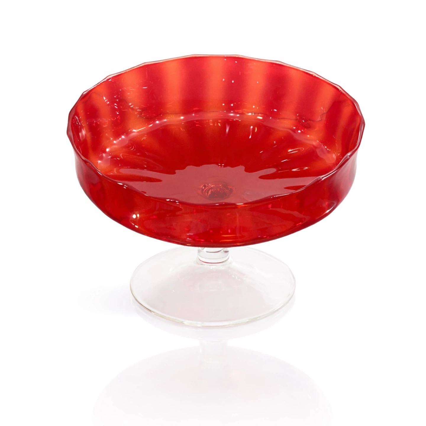 Hand-blown studio art glass pedestal compote, executed in saturated cranberry glass with subtle tangerine-orange striping that emerges along the rim and interior walls under strong light. The bowl features a sculptural, softly scalloped lip and is elevated on a clear stem with a wide, balanced foot—an elegant, display-forward form intended as a centerpiece or presentation bowl.