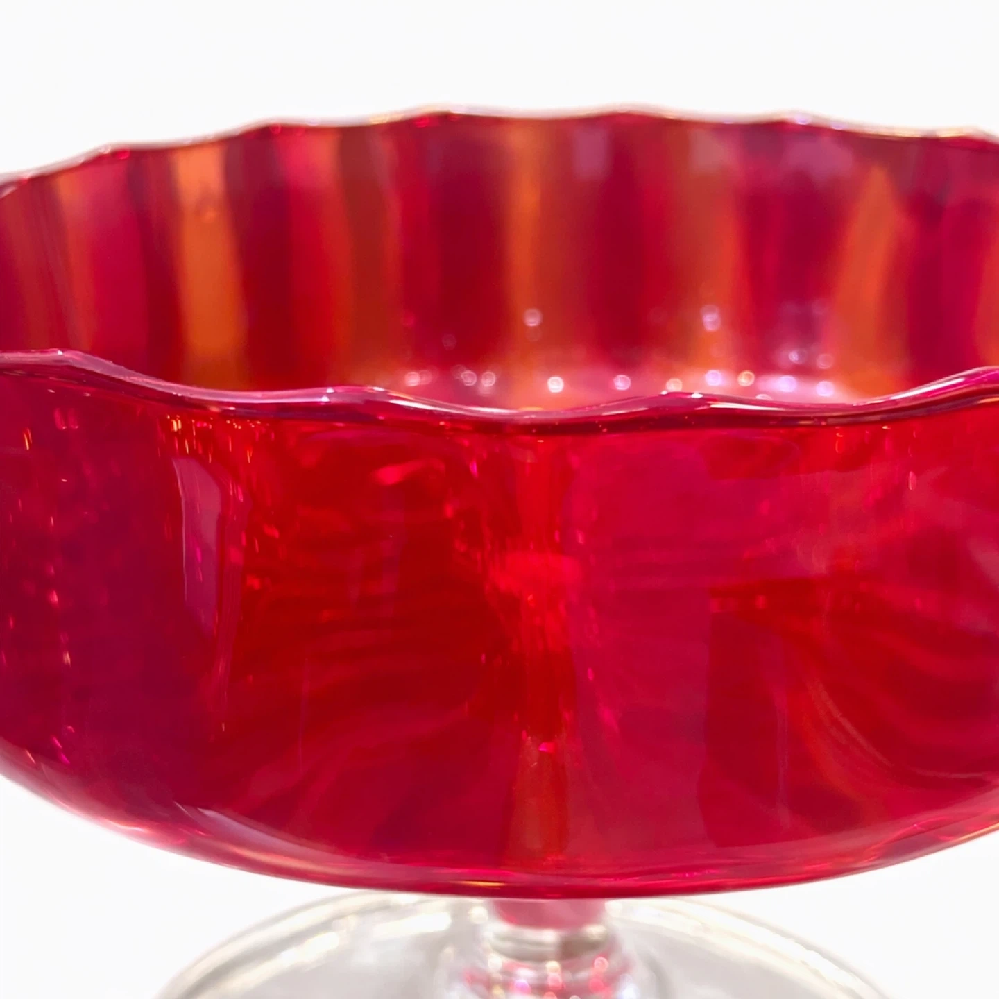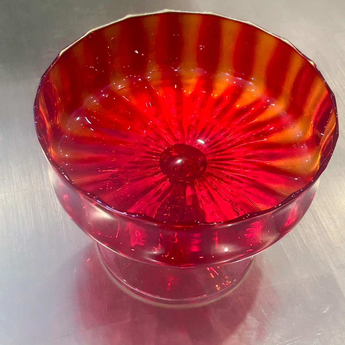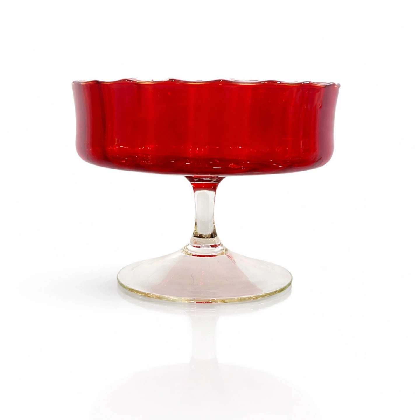 cranberry glass, gold ruby glass, studio art glass, pedestal compote, tazza bowl, hand blown glass, pontil mark, mid century modern, MCM decor, hollywood regency, sculptural glass, red art glass, ombre glass, centerpiece bowl, fruit bowl, candy dish, vintage glass, collectible glass, 20th century glass, art glass bowl