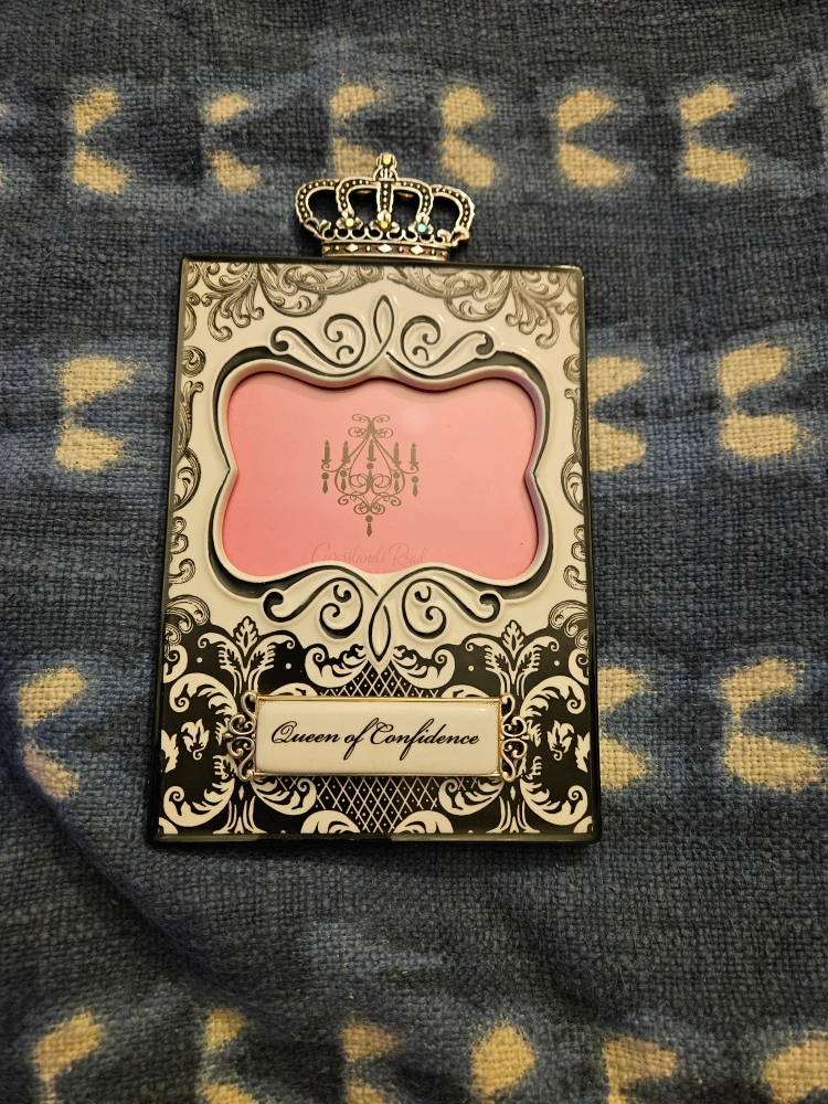 Excellent condition. Never been used Queen of Confidence picture frame with velvet back and kickstand. Bought this as a gift but lost track of it and the event passed. The opening for the photo is approximately 3 x 4 inches.