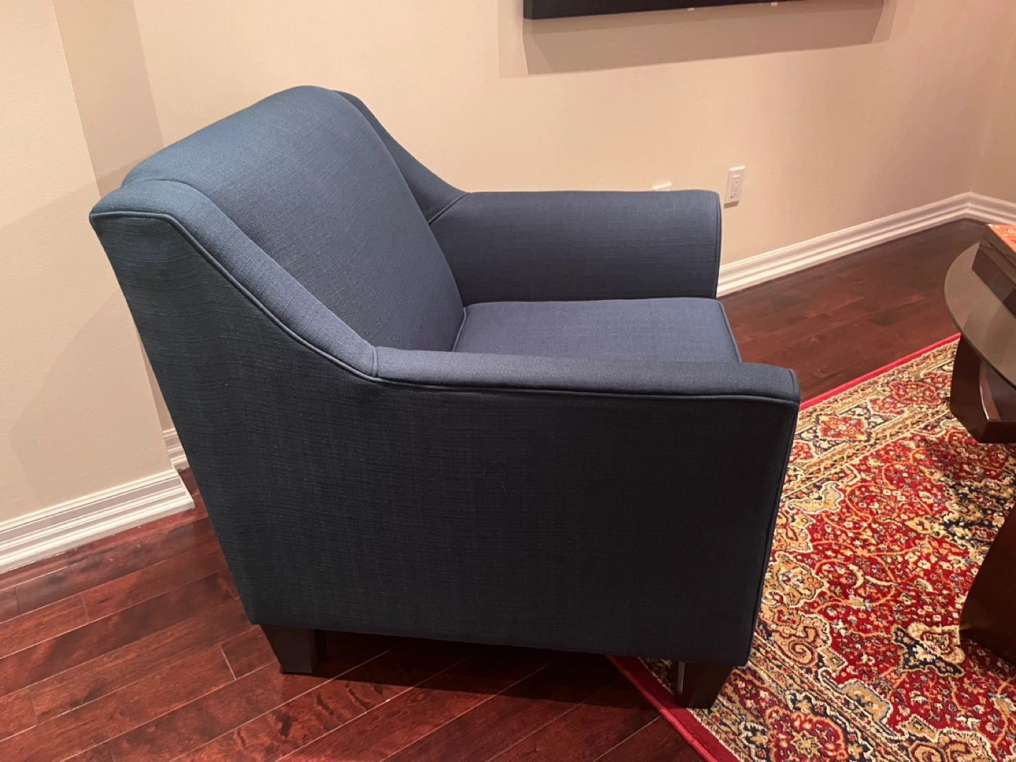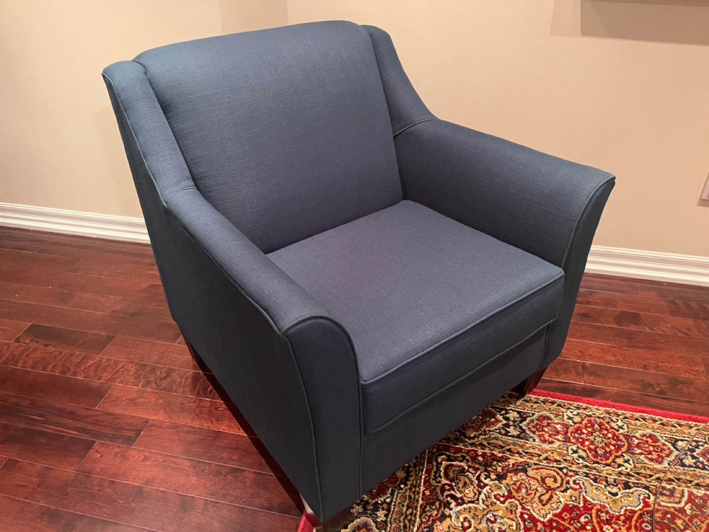 Large comfy arm chair perfect for dining rooms. Blue with dark wood legs. In excellent condition, very rarely sat on.