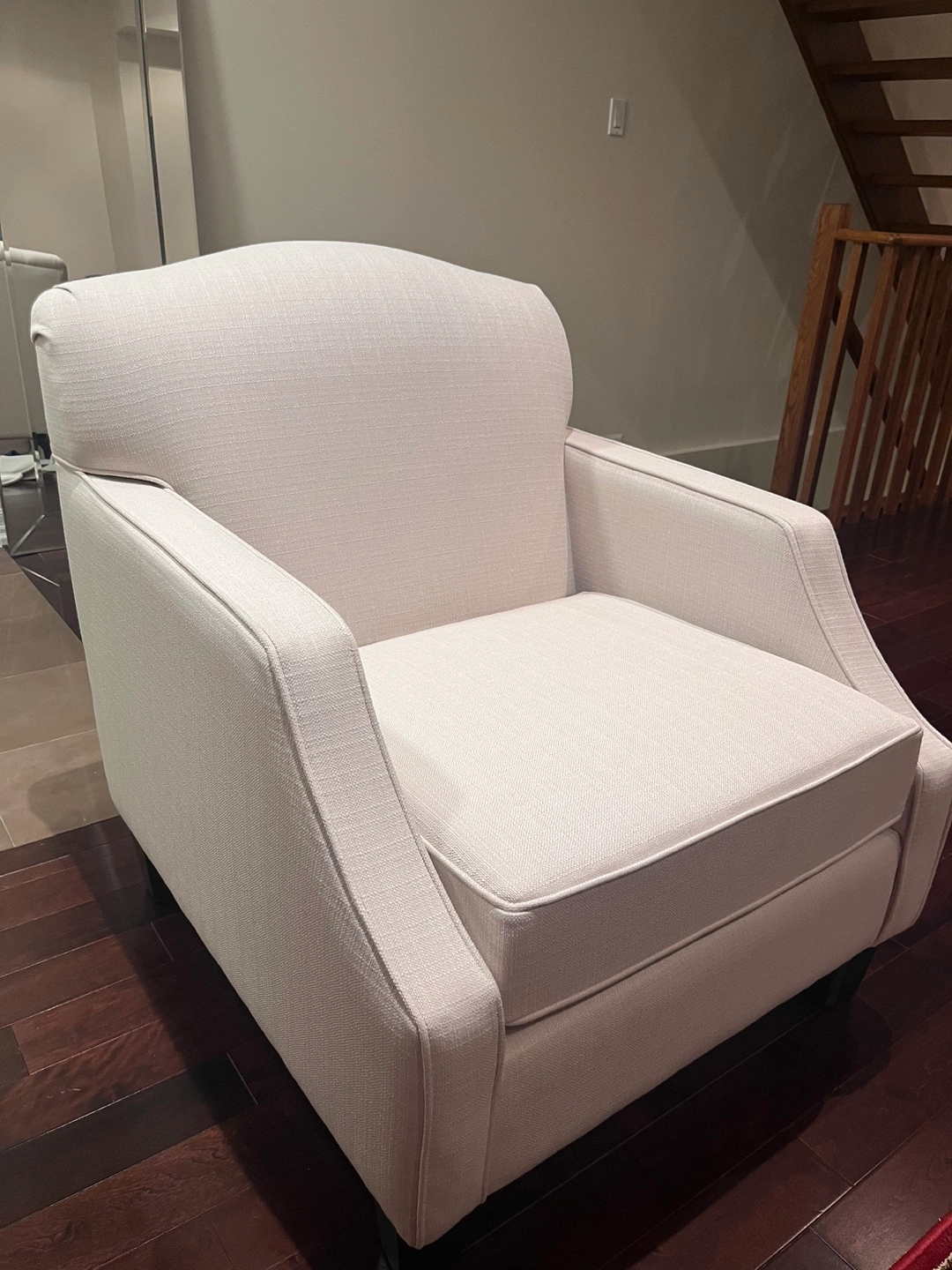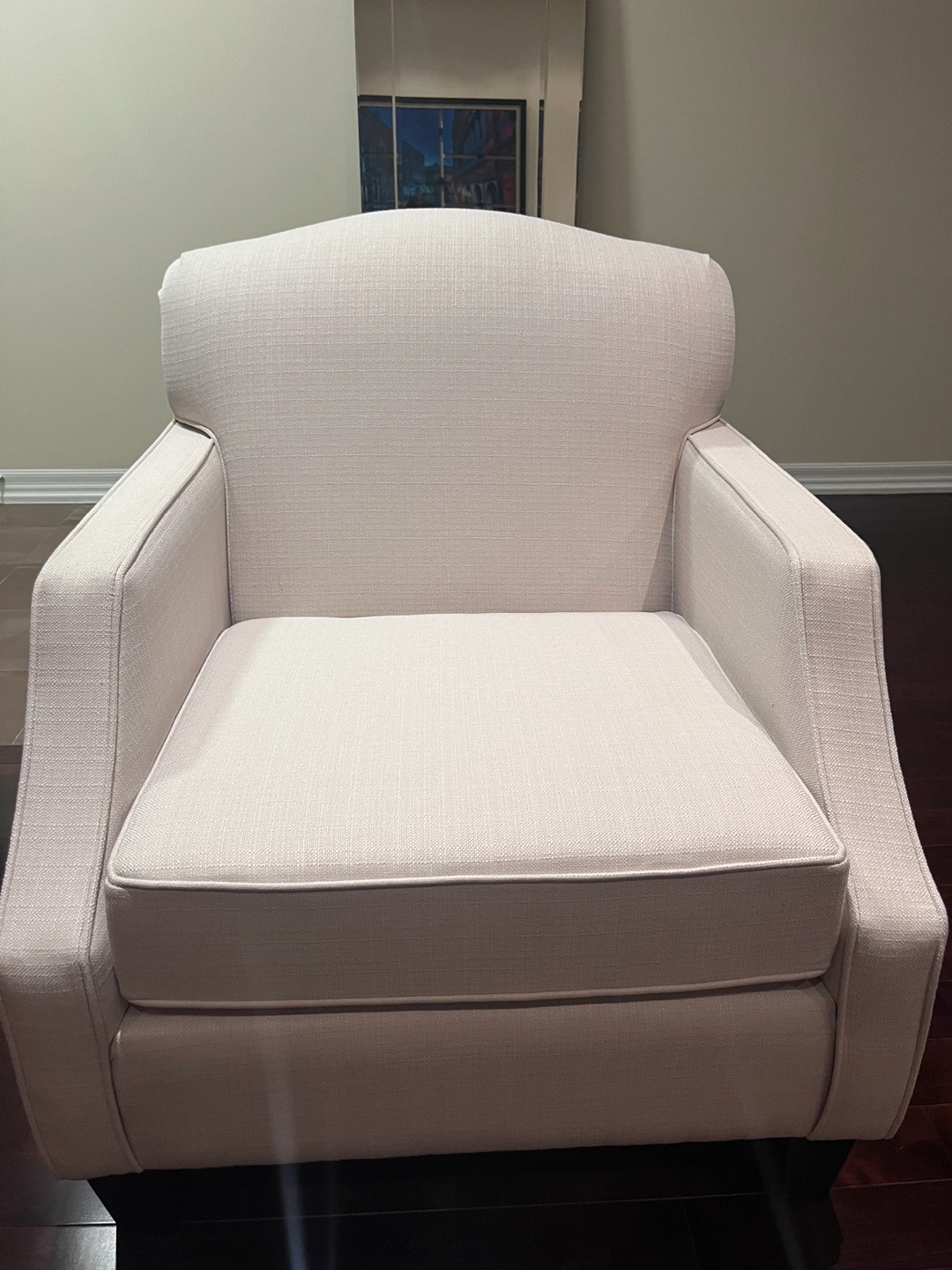 Large comfy arm chair perfect for dining rooms. Ivory with dark wood legs. In excellent condition, very rarely sat on.