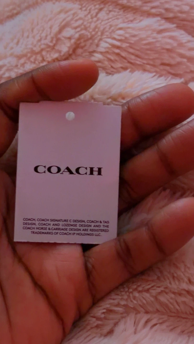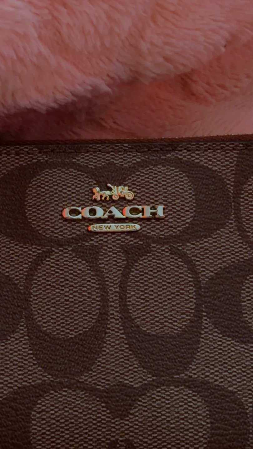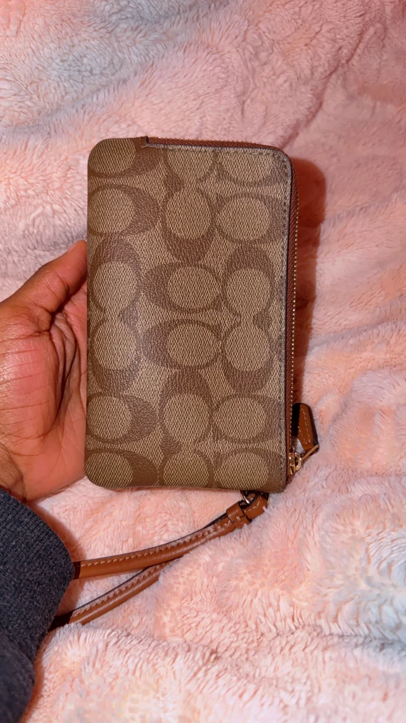 This Coach wristlet features the signature C pattern in brown and tan. It has a zip-around closure and a detachable leather wrist strap. It's perfect for carrying essentials like cards and keys.