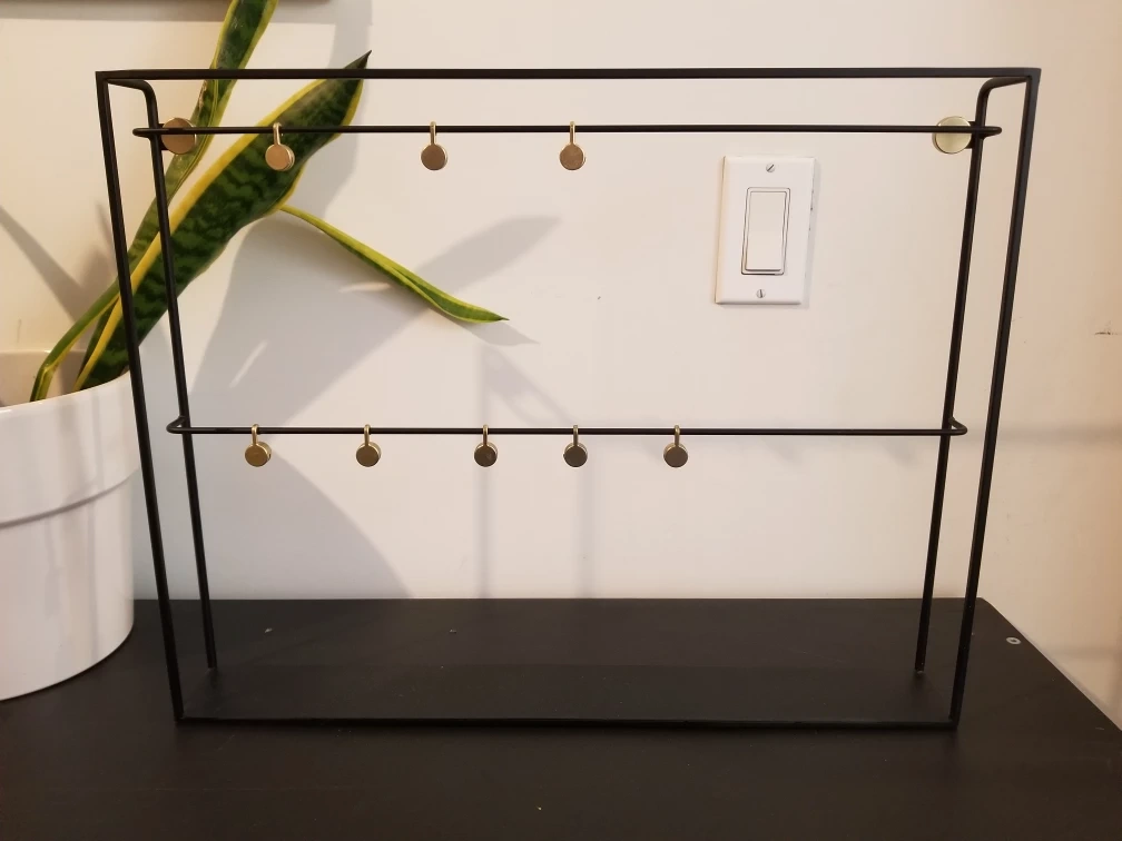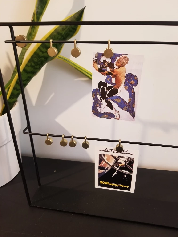 Black with gold details. Comes with 8 clips to hang photos/papers on the rails. Has a small shelf along the bottom to hold your keepsakes.