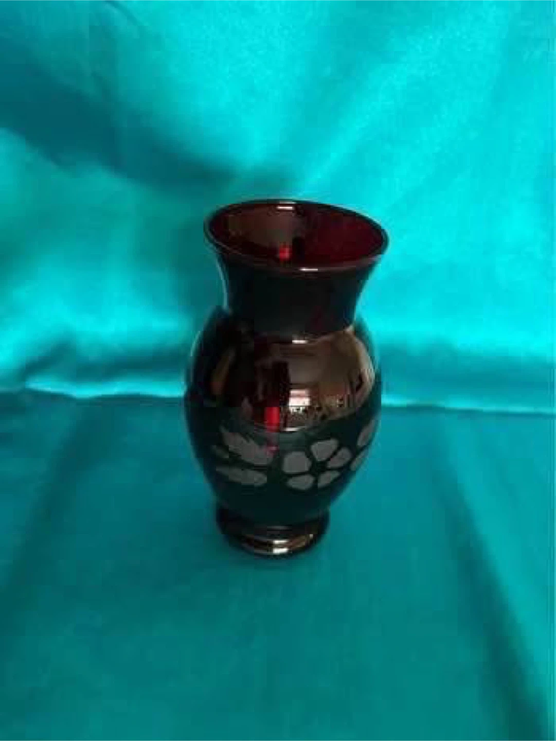 Beautiful ruby red glass vase. Features an etched floral pattern. Elegant addition to any home décor. Perfect for displaying fresh or dried flowers.