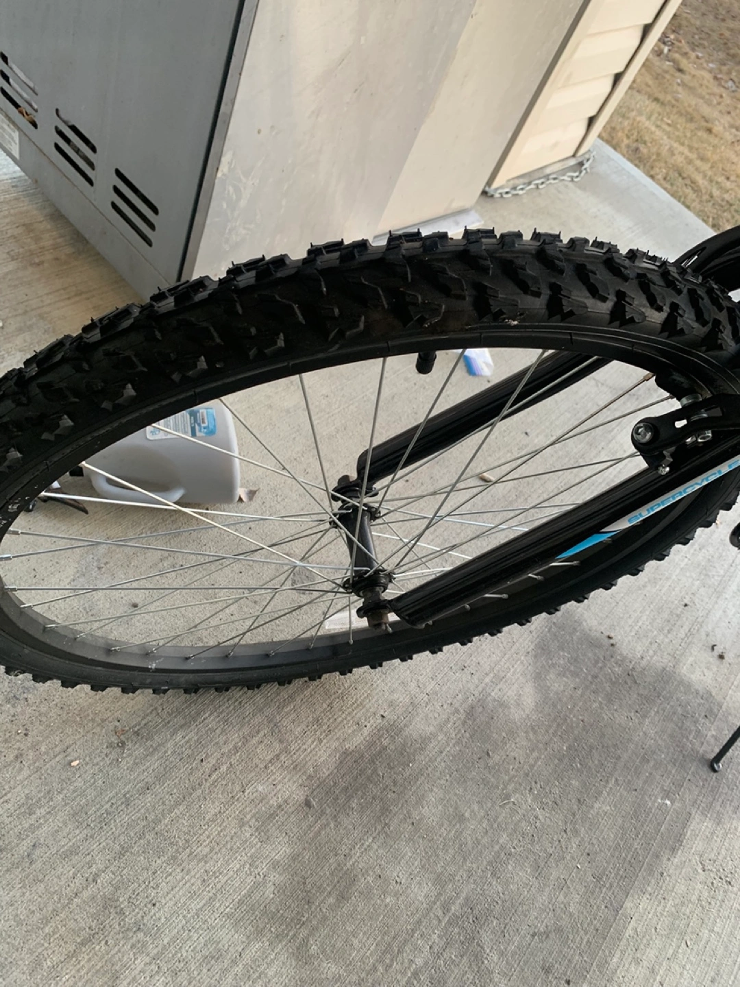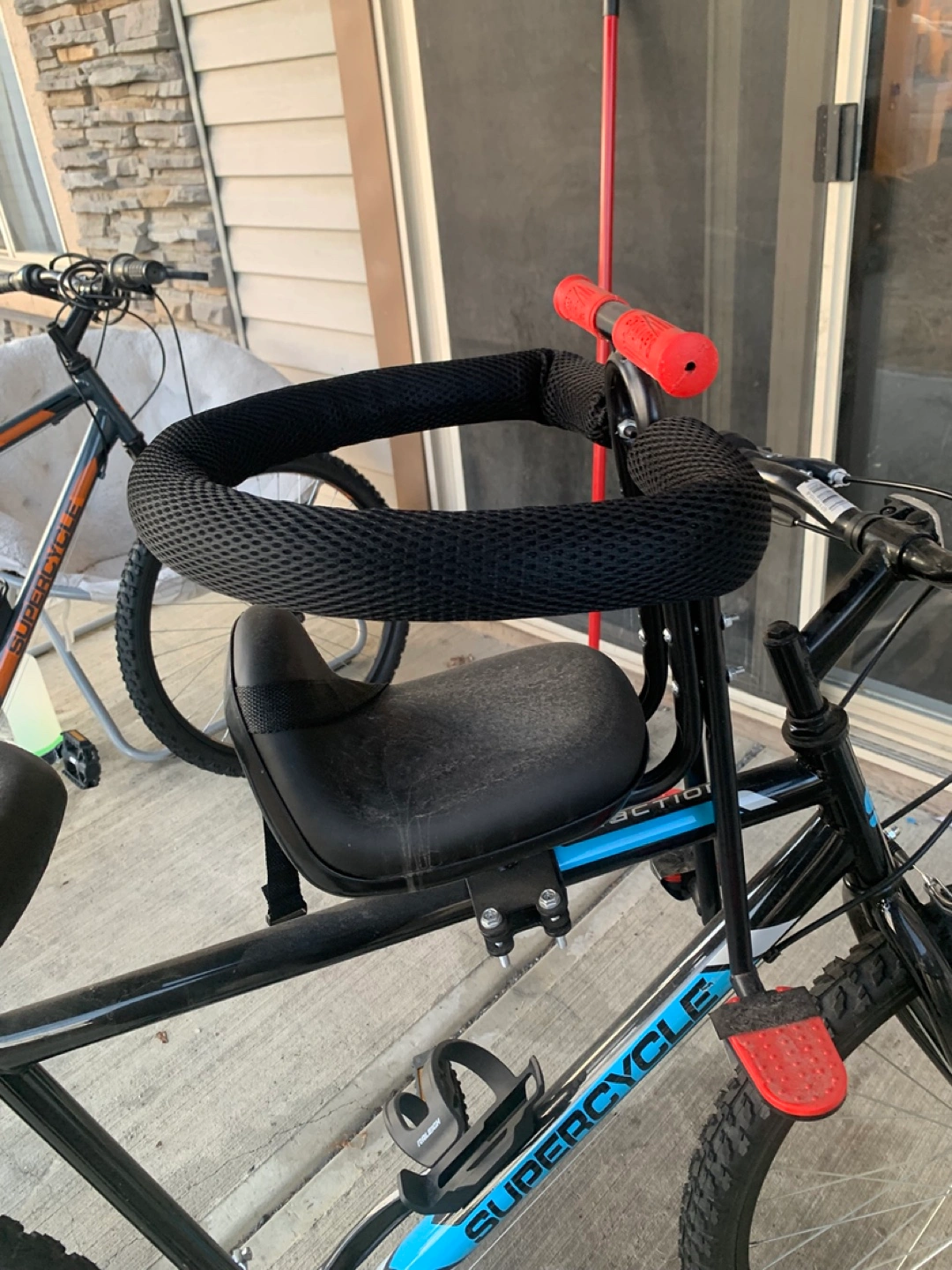 Black Supercycle bicycle with a front-mounted child seat. It features a durable frame and knobby tires. This bike is great for taking your little one along on rides! Child bike seat removable if not wanted but 25 if included brand new bike rode it a few times original seat included