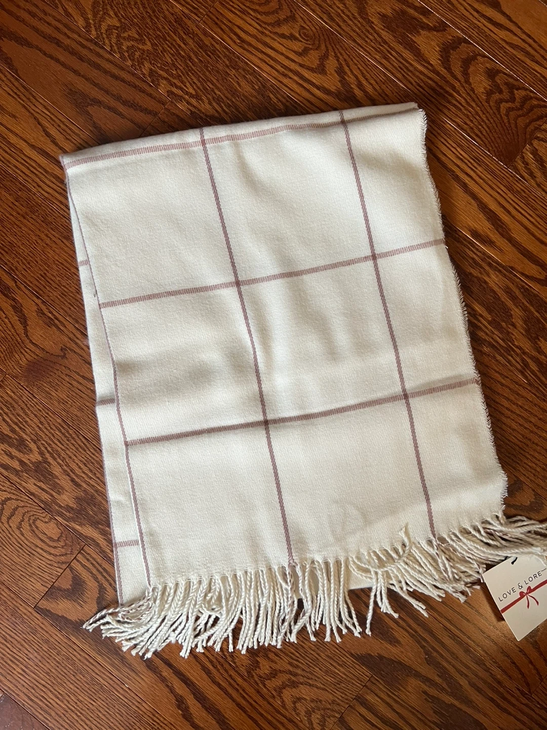 A cozy Love & Lore scarf with a cream base and subtle plaid pattern. It features a soft texture and fringed edges. Perfect for adding a touch of warmth and style to your outfit!