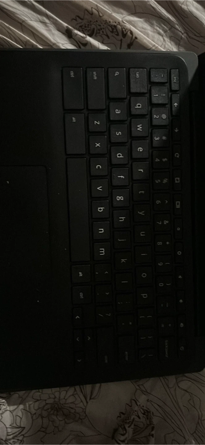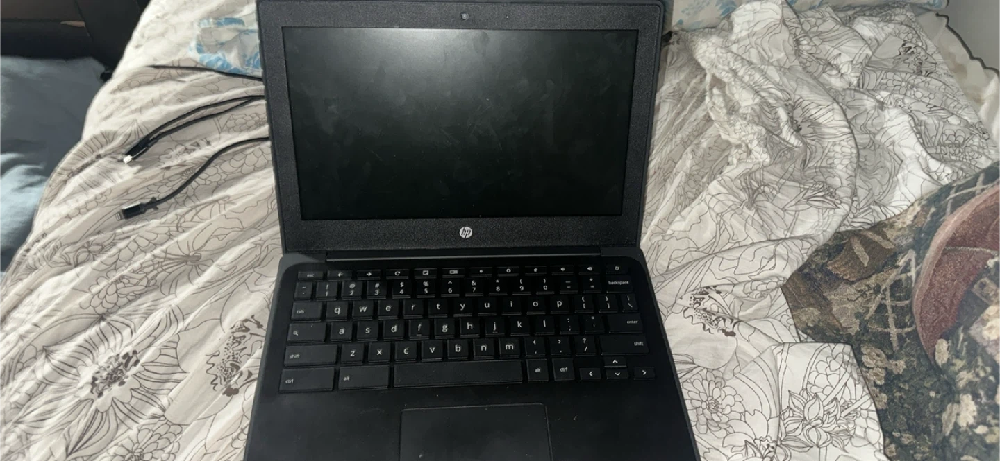 This is a black HP Chromebook laptop. It features a standard QWERTY keyboard and a trackpad. Great for schoolwork or everyday browsing!