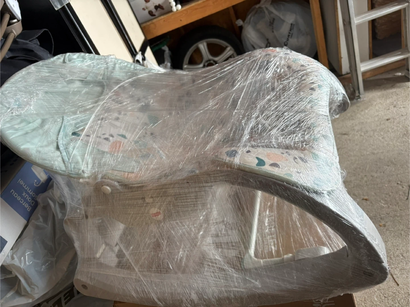 This baby rocker has a light green cover with a fun terrazzo pattern. It's designed for comfort and ease of use for little ones. Suitable for infants.