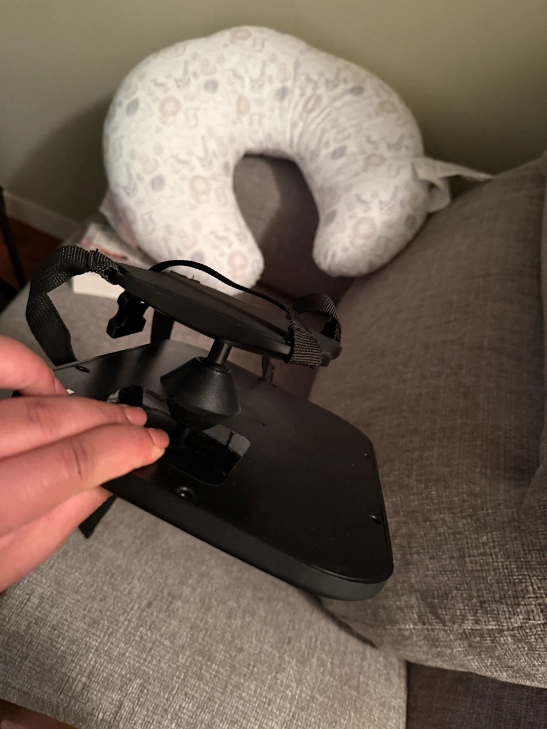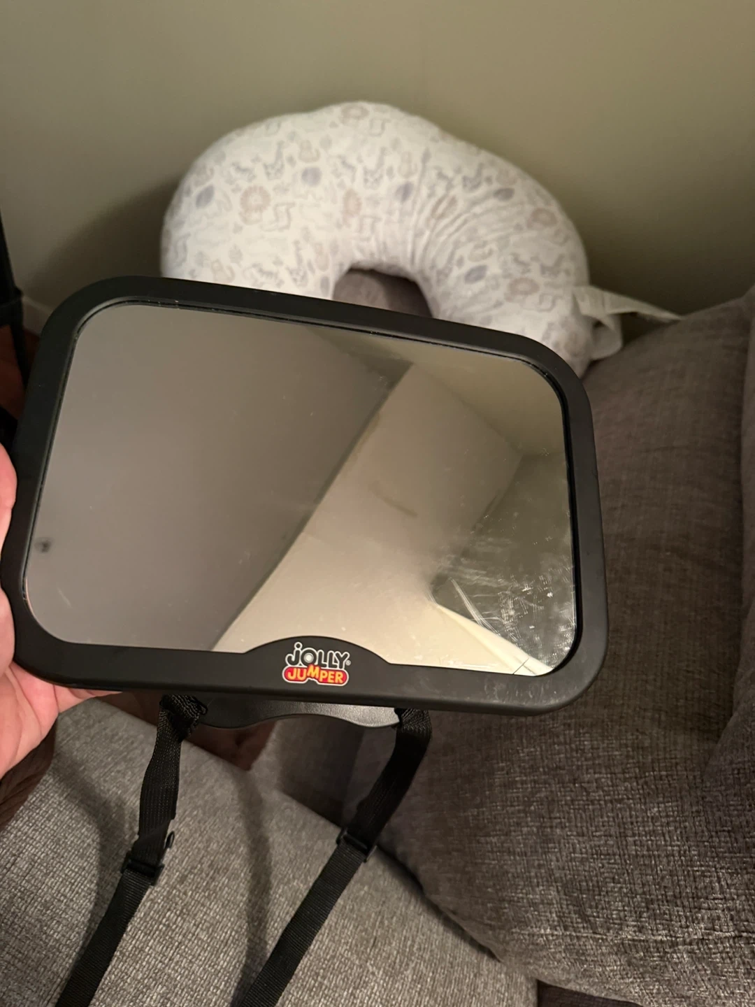 This Jolly Jumper car mirror lets you keep an eye on your little one in the backseat. It attaches easily to the headrest with adjustable straps. Shatter-resistant design for safety.