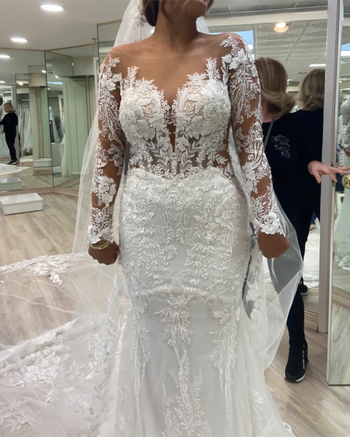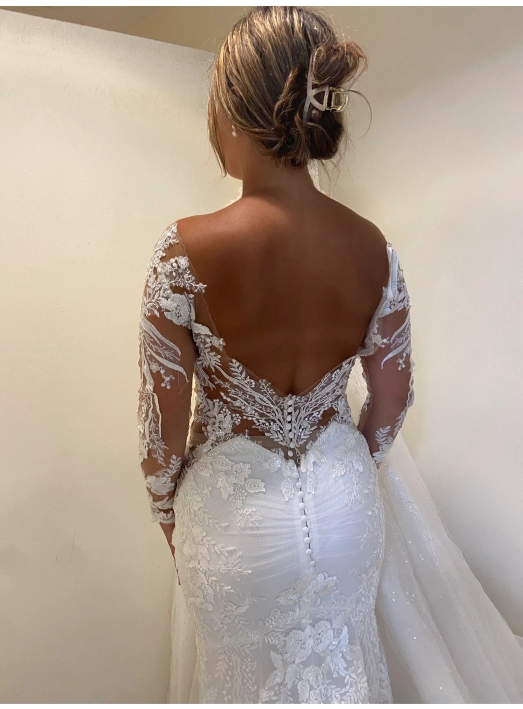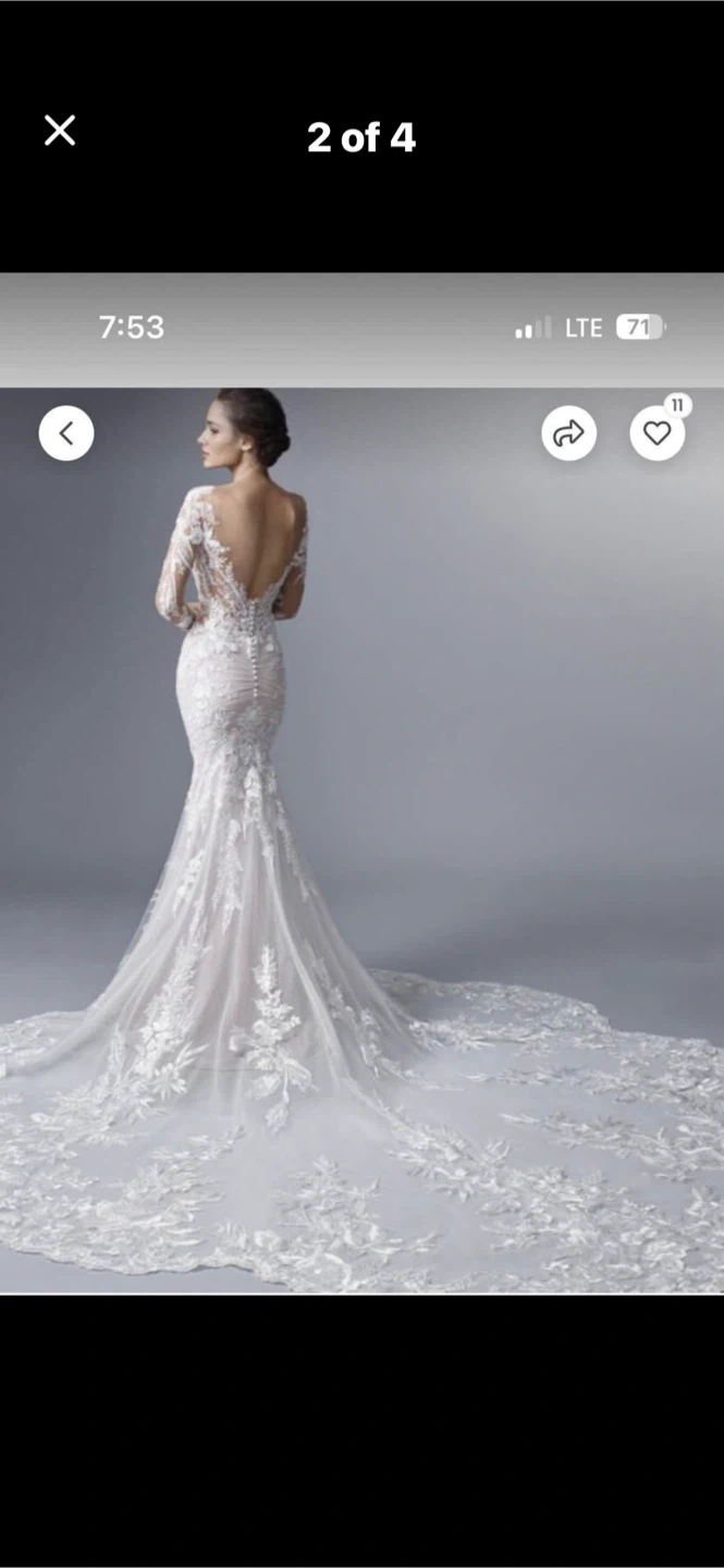 This is a beautiful lace wedding dress by Elysee Atelier. It's a US size 8 and has a stunning fit and flare silhouette. Alterations free if needed, purchased at Mona Richie