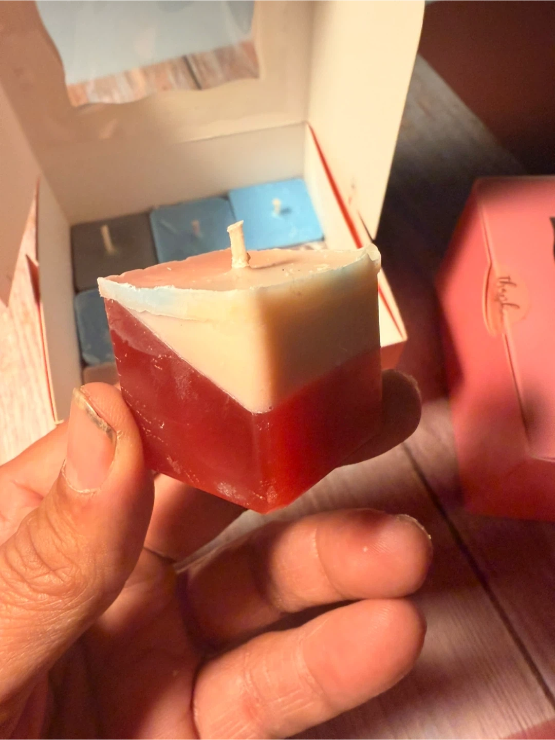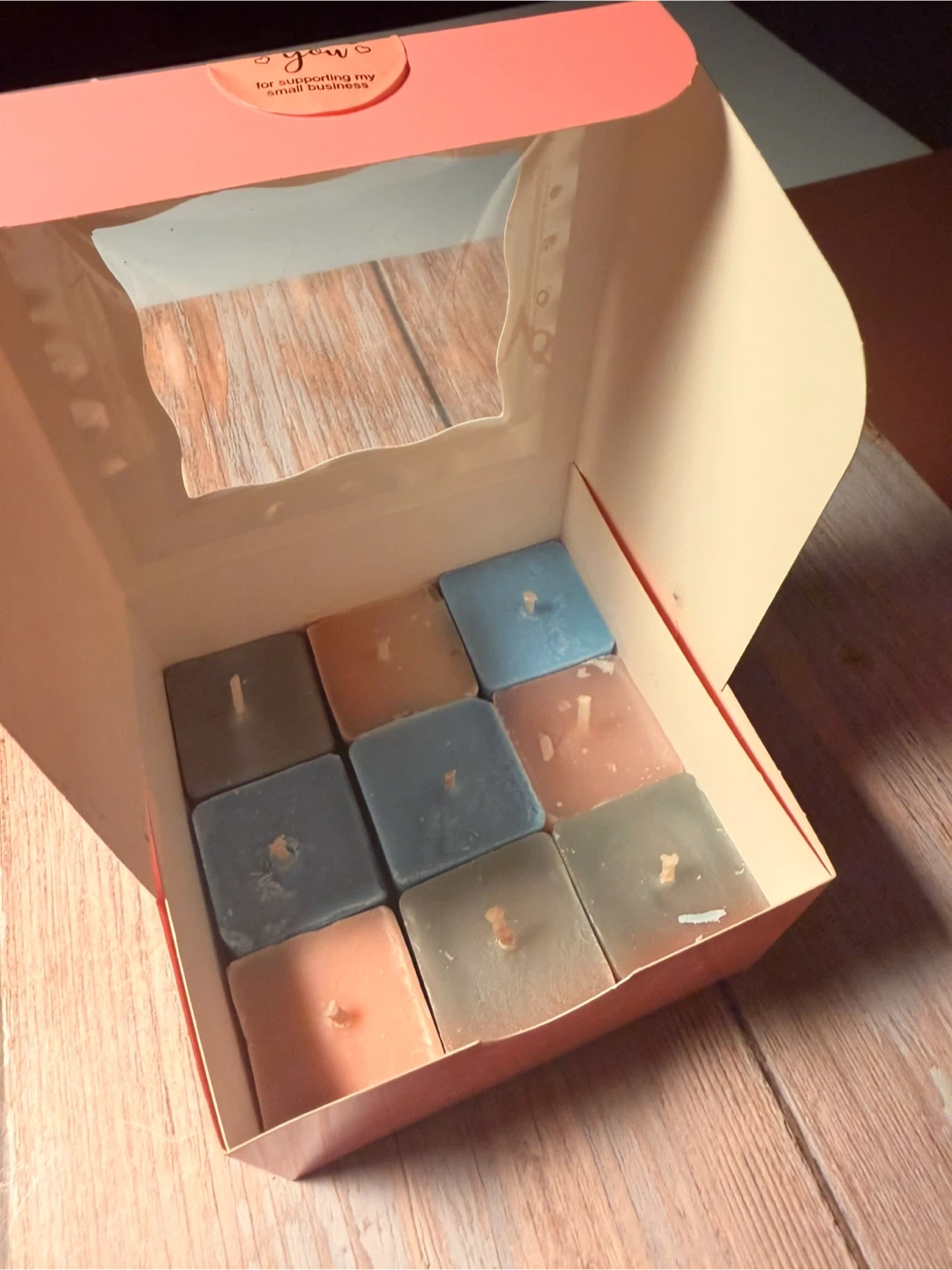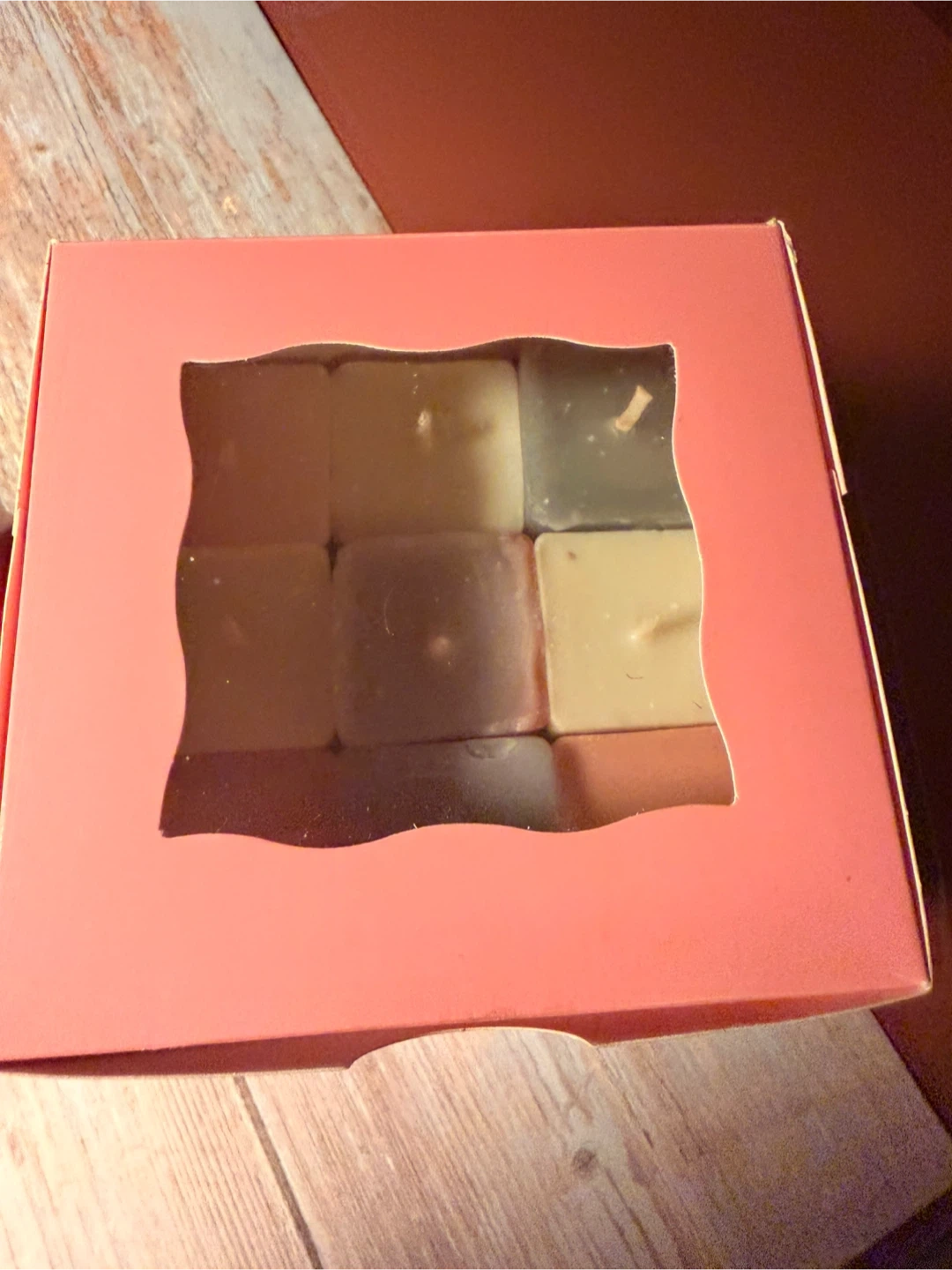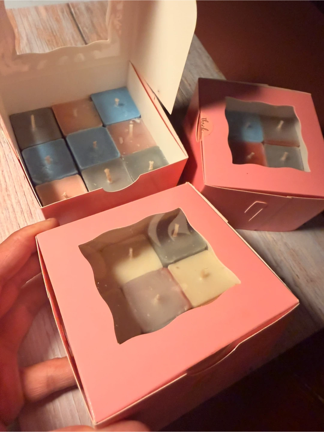 A collection of nine scented cube candles in various colors. These candles come in a pink gift box with a clear window display. Each candle is roughly cube-shaped and appears to be made of wax. They're perfect for adding a touch of ambiance to any room!