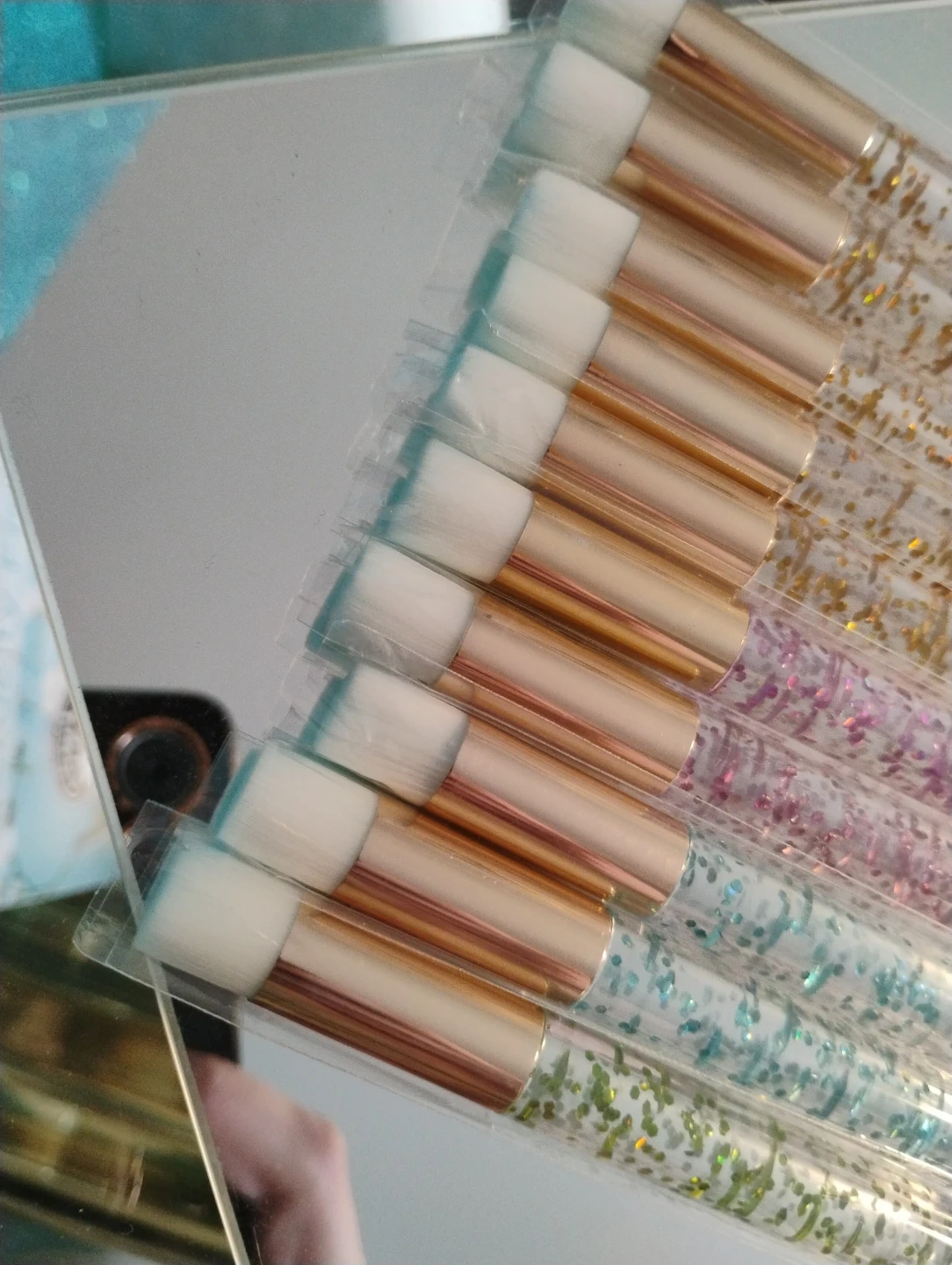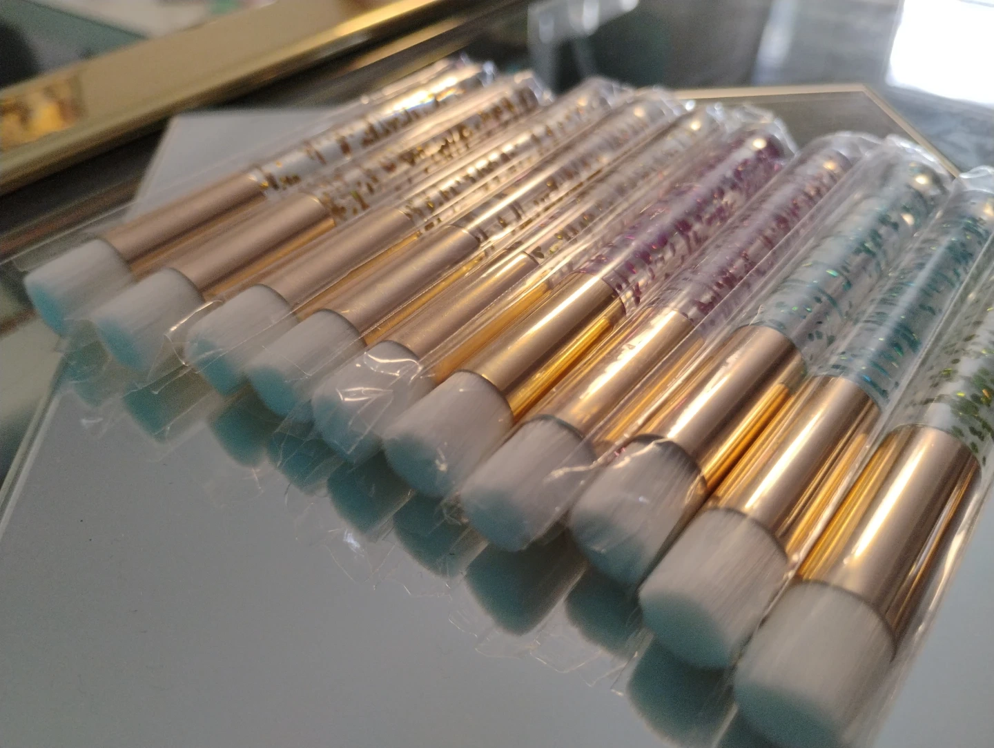 A set of 10 makeup brushes with clear handles filled with colourful glitter. The brush heads are white and the handles have a rose gold accent. They're perfect for applying makeup or for cleansing lash extensions.