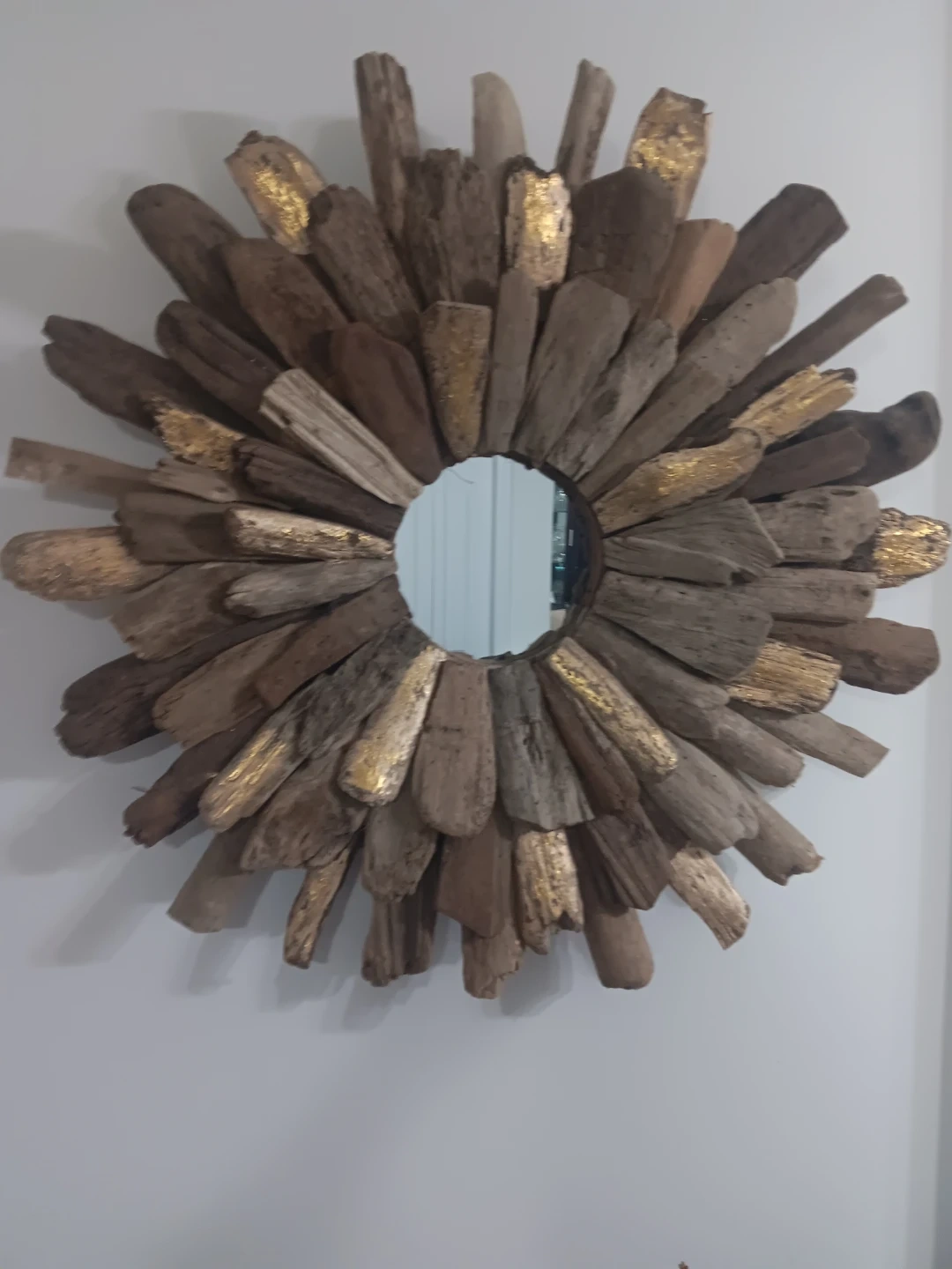 A unique sunburst mirror framed with natural driftwood pieces, some accented with gold leaf. It's a striking decorative piece for any wall. Measures approximately 24 inches in diameter.