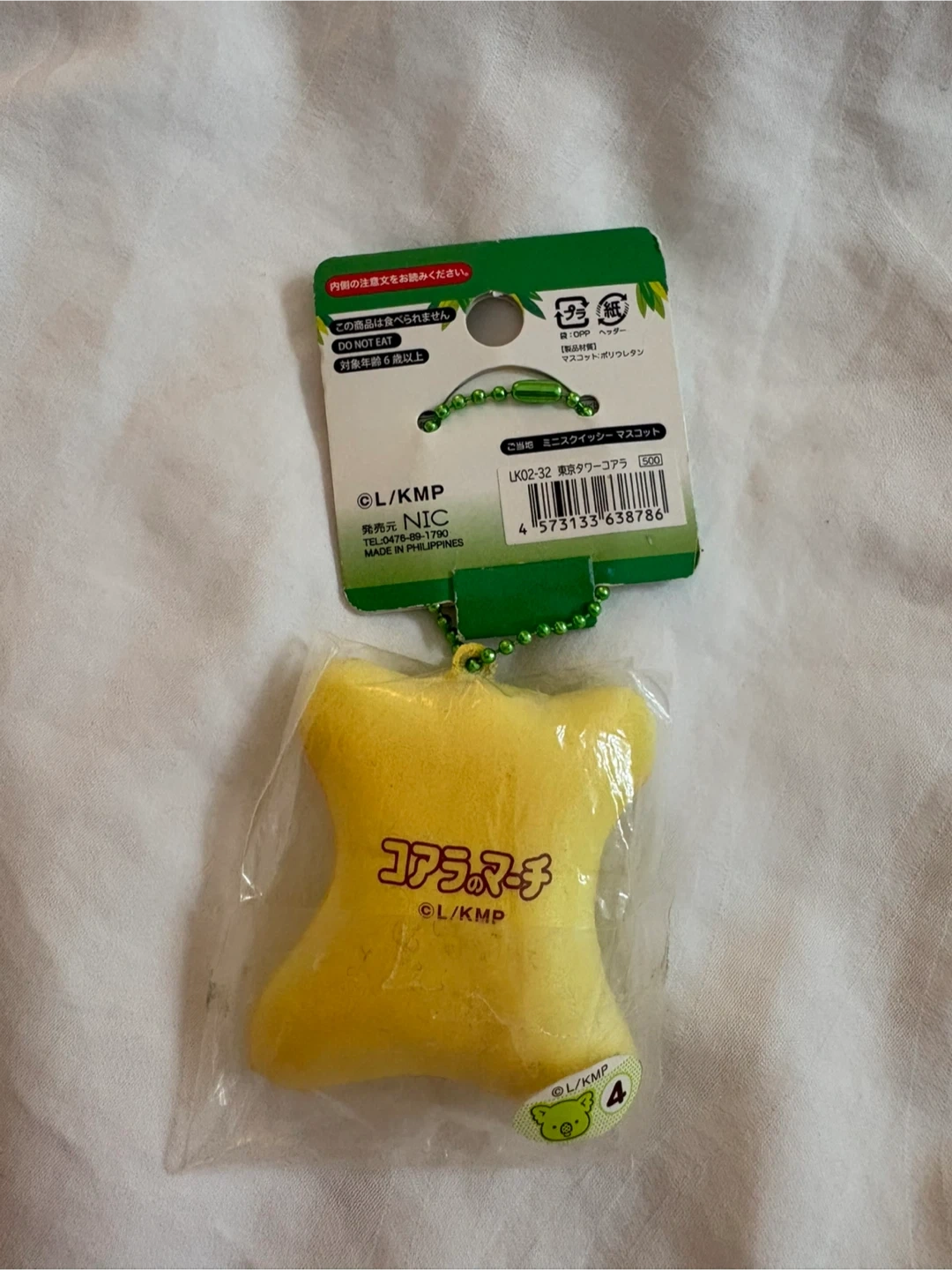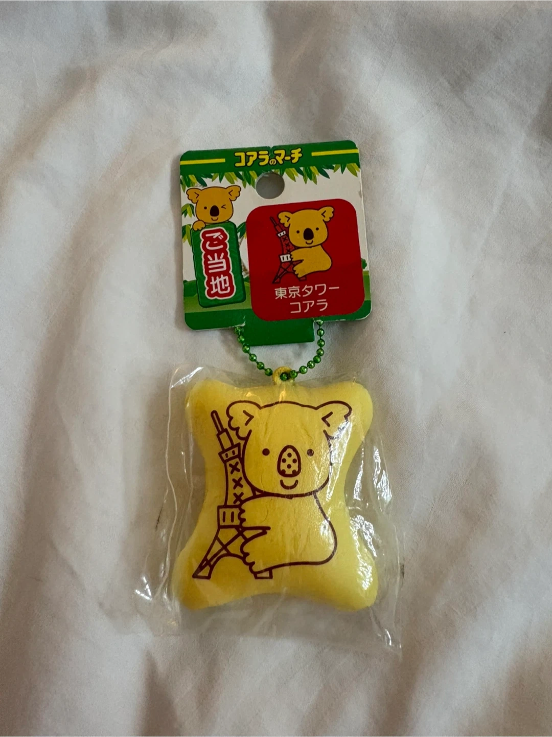 Yellow squishy toy featuring a koala character holding the Tokyo Tower. It's attached to a green beaded keychain. Made of polyurethane foam. Perfect for decorating bags or keys!