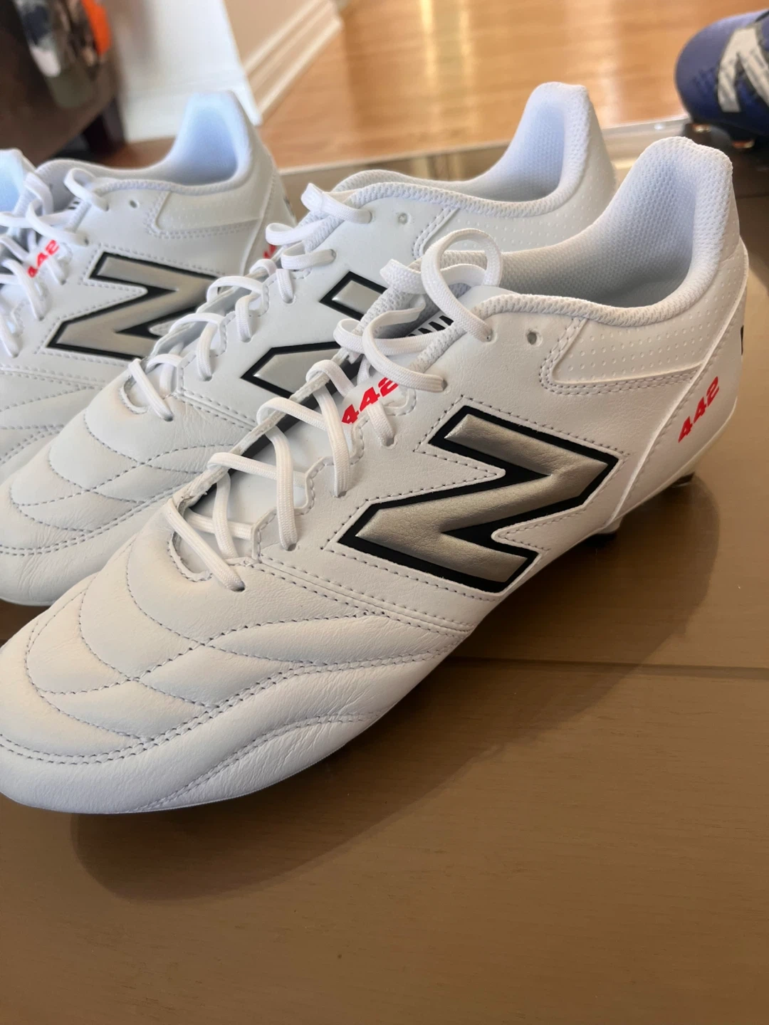 New Balance 442 soccer cleats in white. These cleats are designed for performance on the field. They feature a durable synthetic upper for a great touch on the ball. Perfect for players looking for reliable cleats!