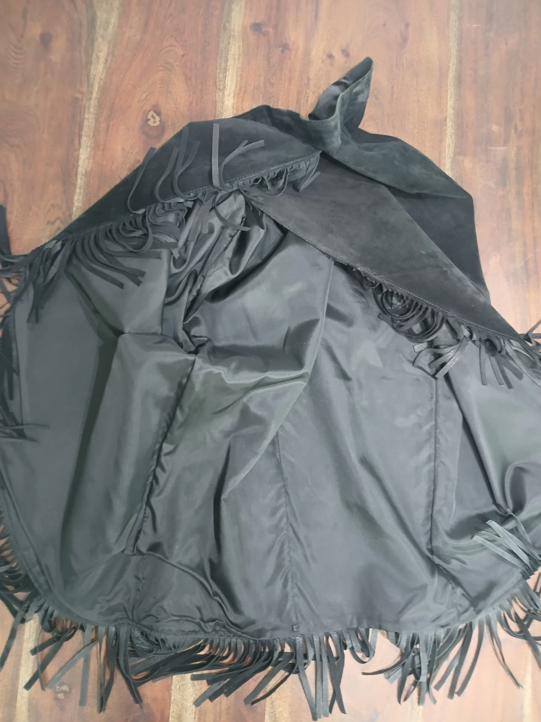 Black suede maxi skirt with fringe detailing. Features a 100% acetate lining. Professionally dry clean only. Made in Canada.