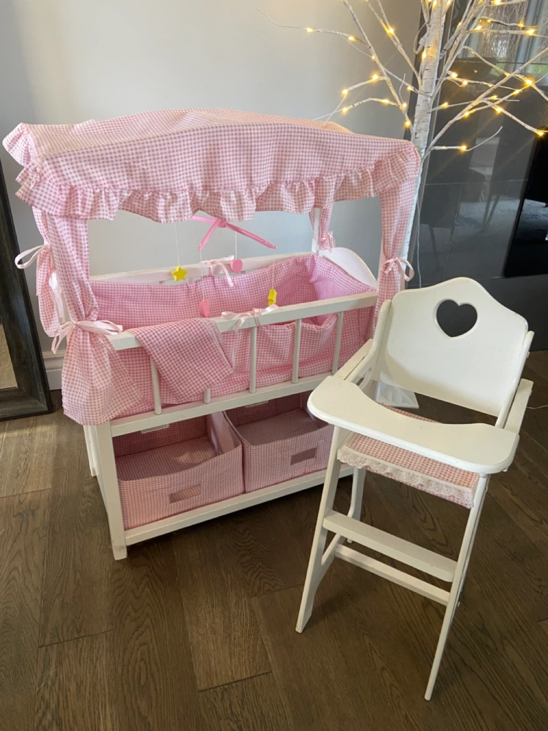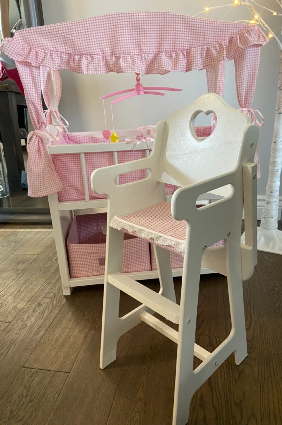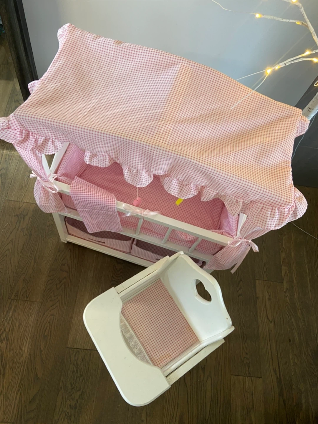 GUC Pink Gingham Wooden Doll Crib with Matching High Chair