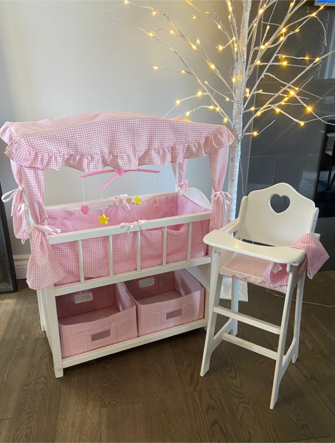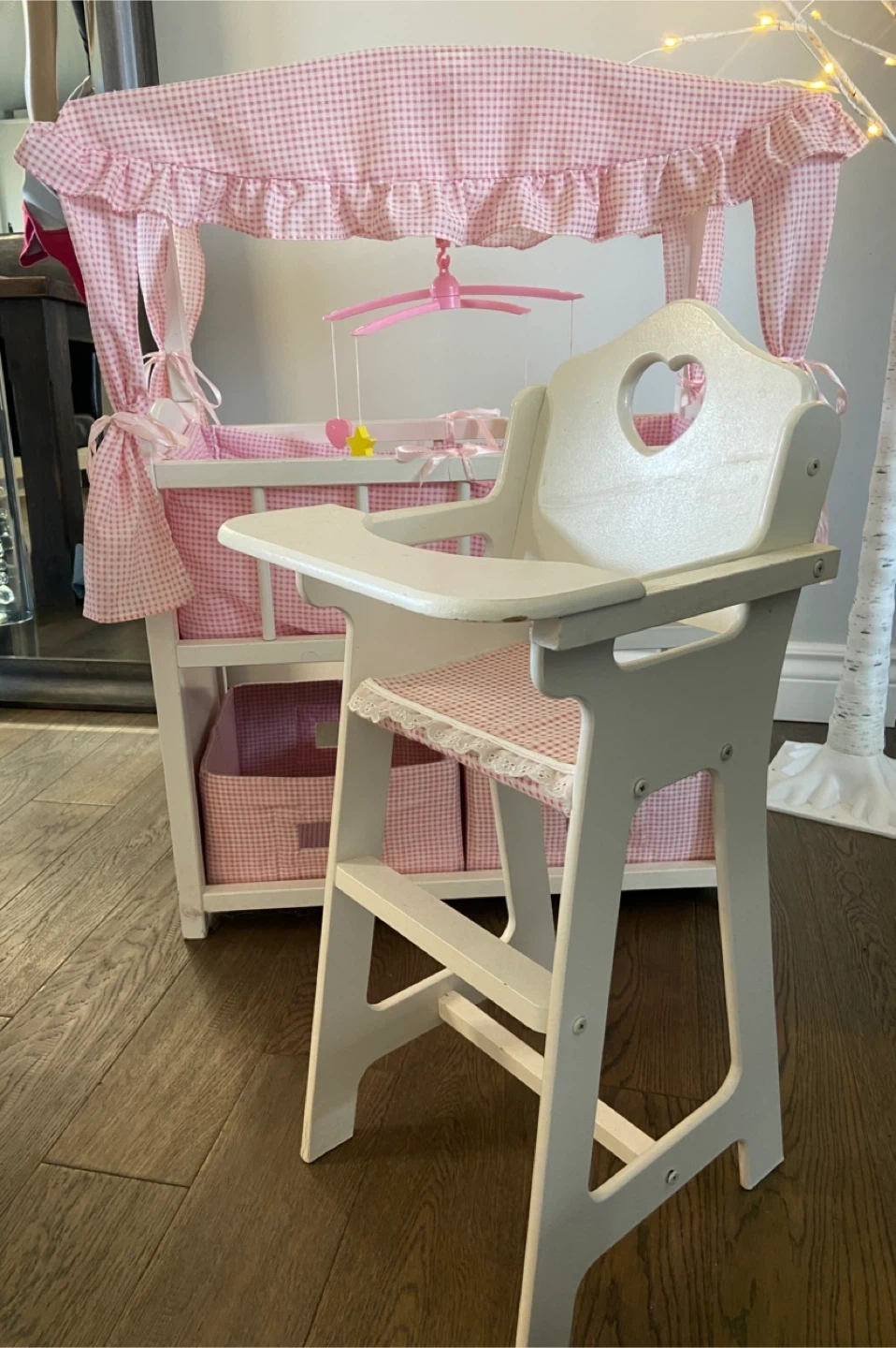This adorable wooden doll nursery set features a crib with a mobile and a matching high chair. It includes two storage bins for accessories