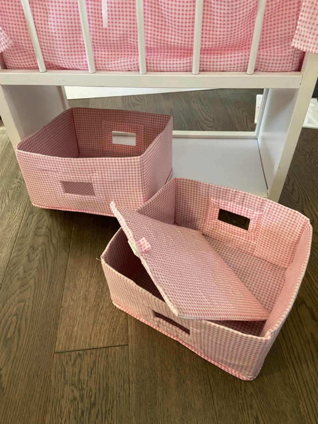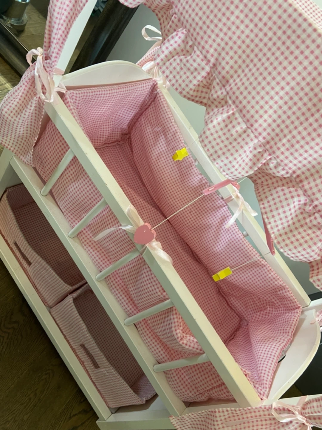 The set is finished in white with pink gingham fabric accents