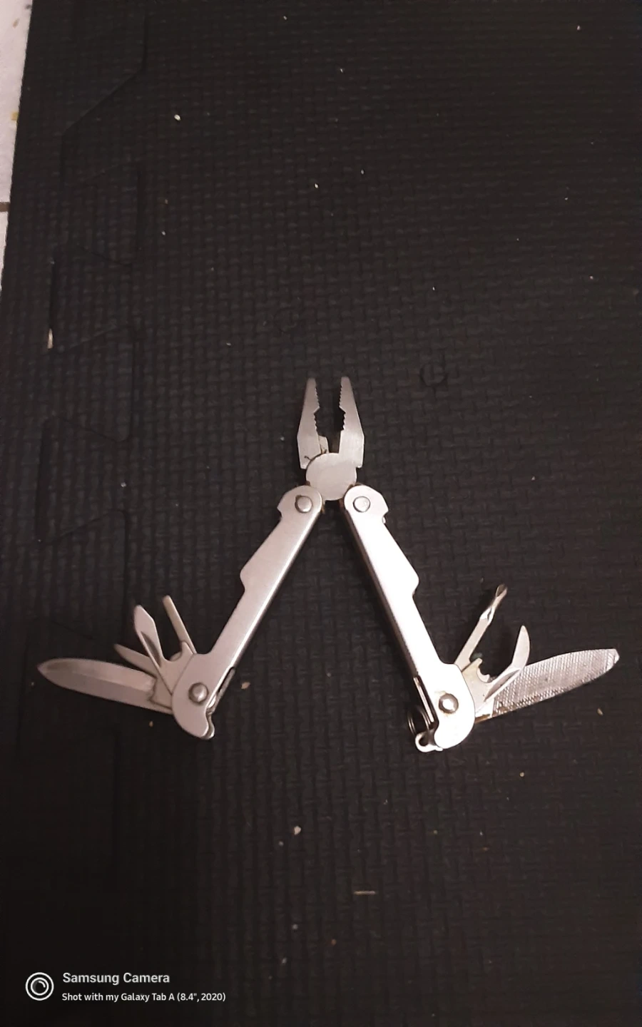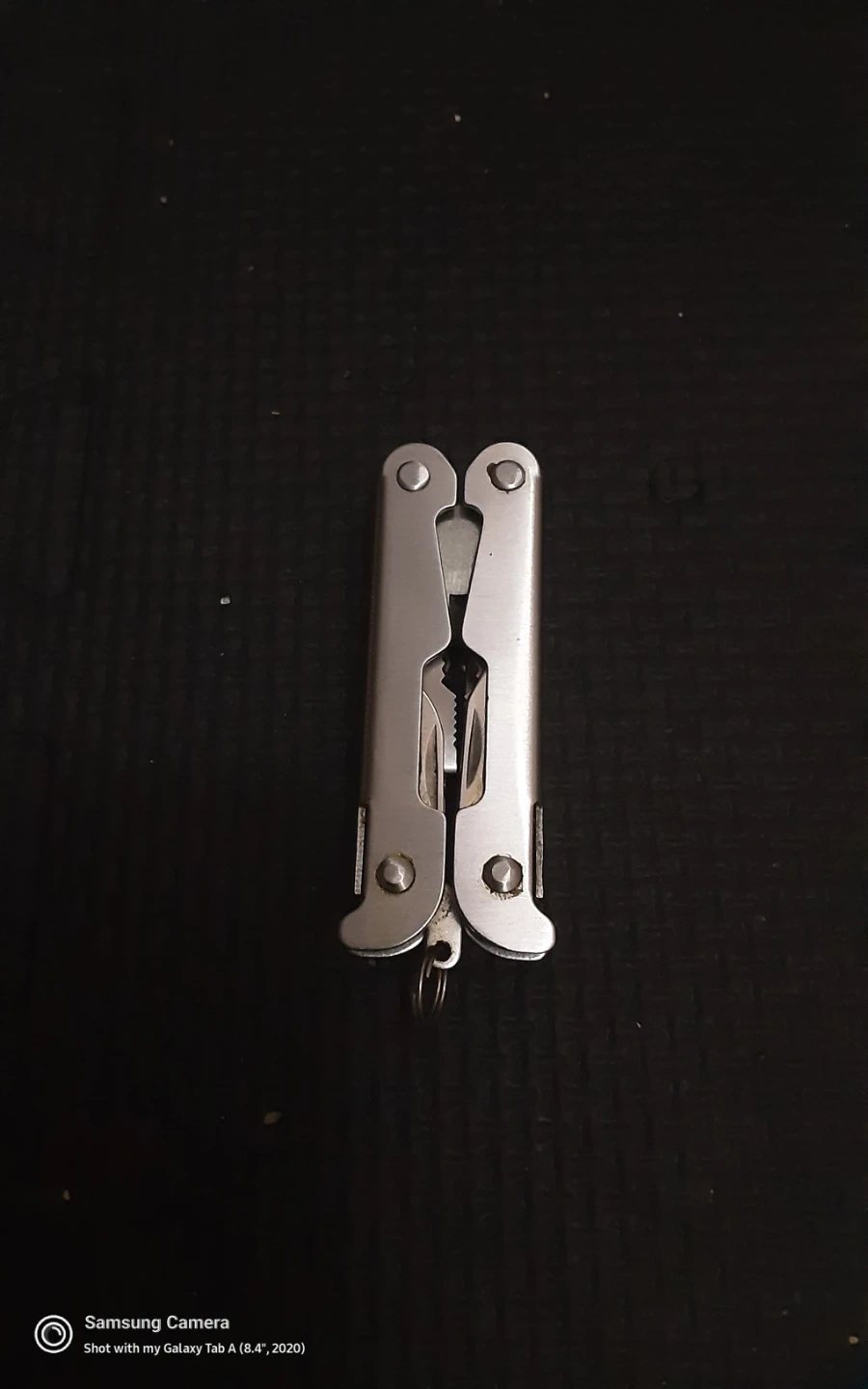 This is a compact multi-tool featuring pliers, a knife, and a ruler etched with imperial measurements up to 6 inches. It's made of stainless steel and includes a keyring attachment for easy portability. Handy for quick fixes and everyday tasks!
