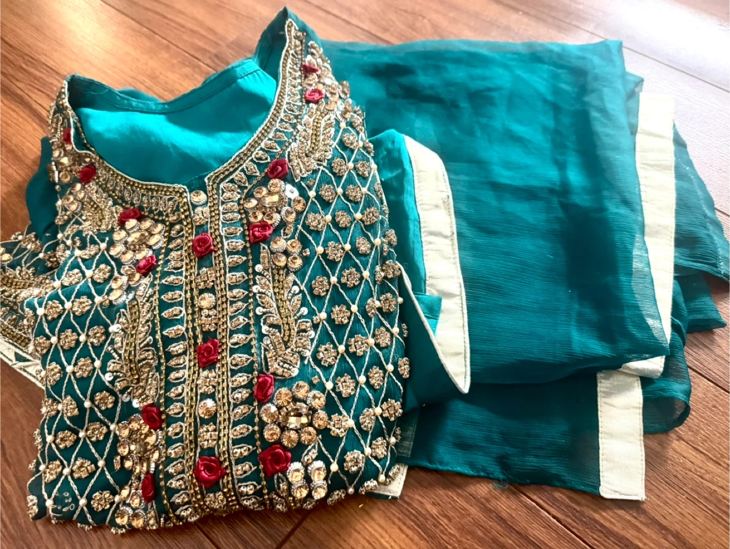 This teal kurti features intricate gold and red embroidery with pearl accents. It comes with a matching sheer dupatta with embellished borders. Perfect for festive occasions!