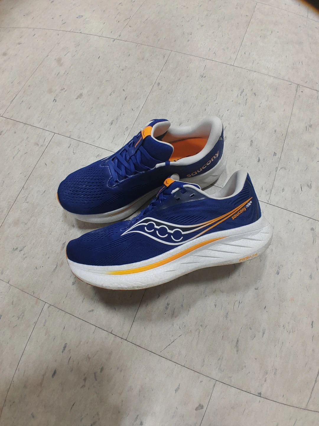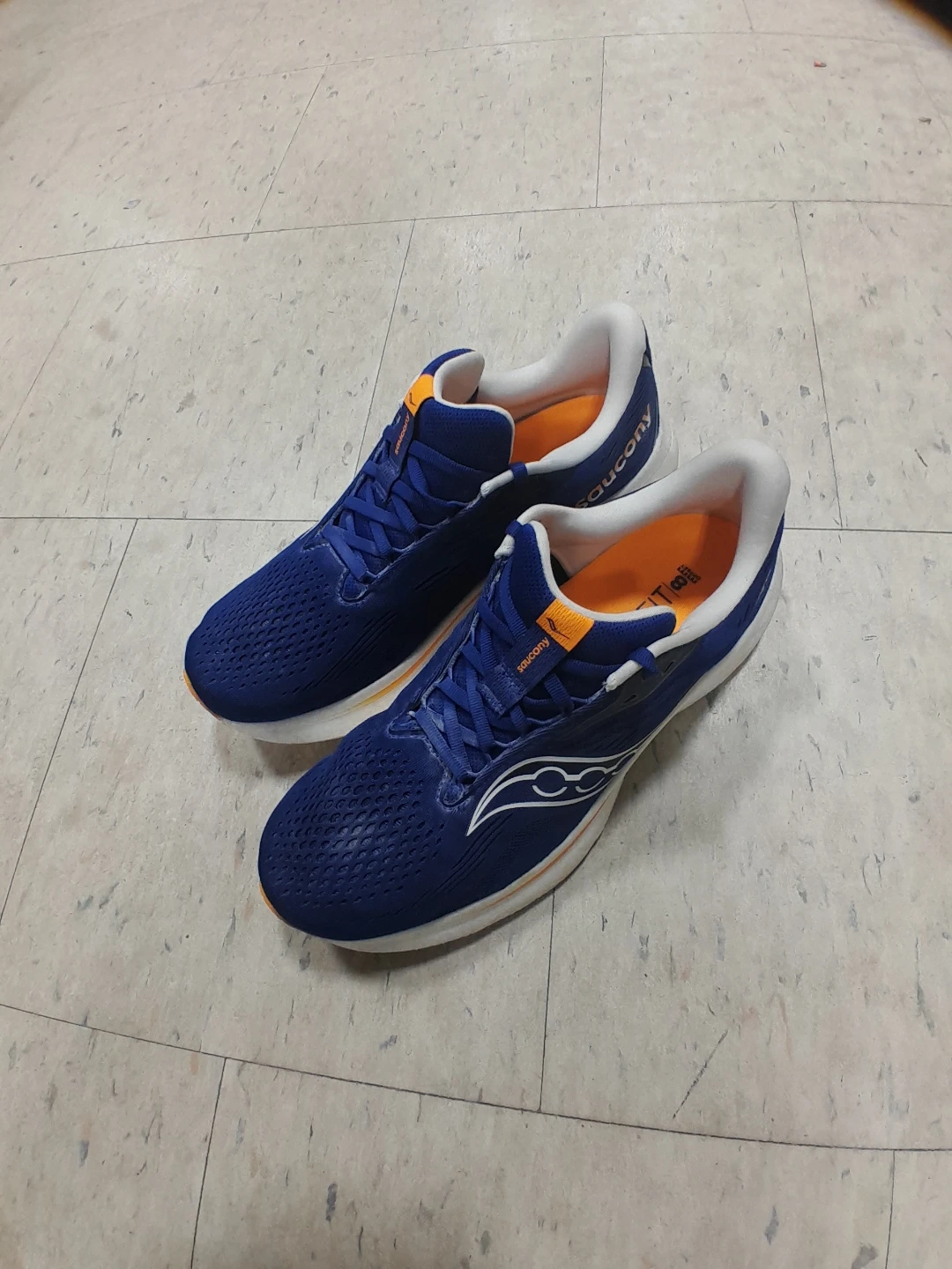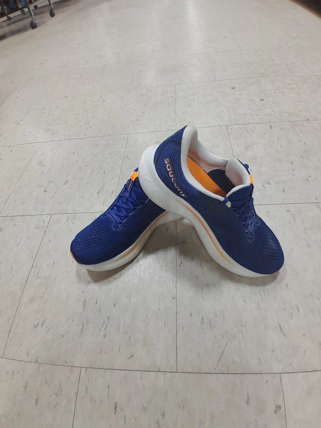 Original Saucony running shoes blue They feature a mesh upper for breathability and a cushioned sole for comfort. The bright orange accents add a pop of colour. Great for your daily runs or gym workouts! Men's Size 9.5