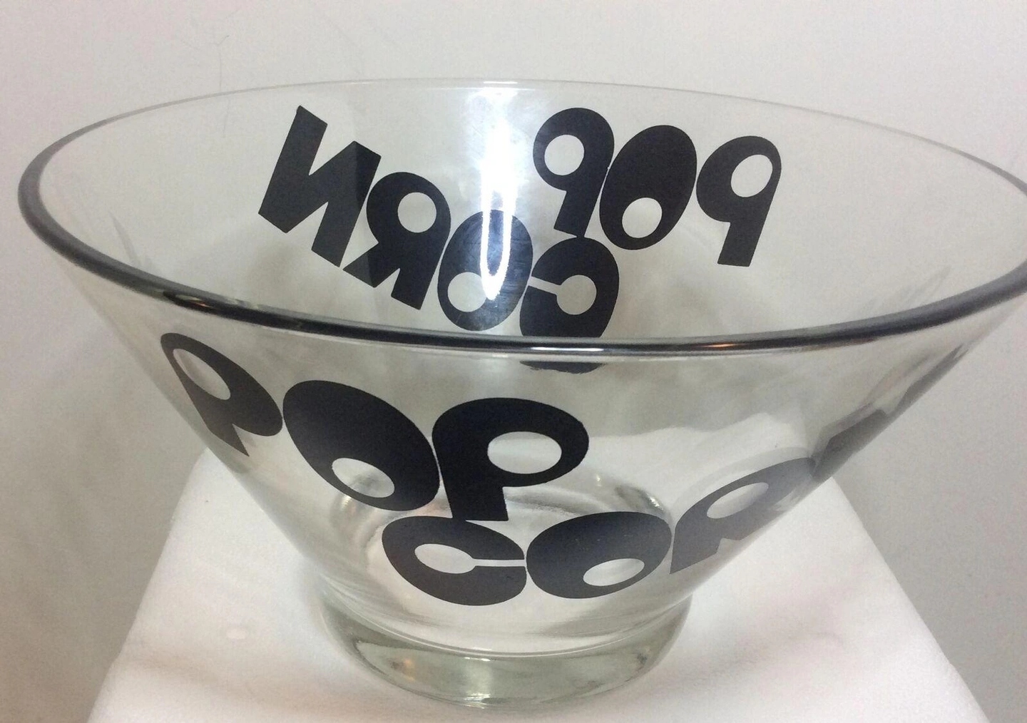 Lights, camera, action! Get ready for your retro movie nights with our vintage glass "POPCORN" bowl, perfect for all your popcorn needs. This large heavy glass bowl features the word "popcorn" in a groovy black font, adding to the retro vibe. The bowl is in perfect condition with little wear to the painted letters and no chips or cracks to the glass.