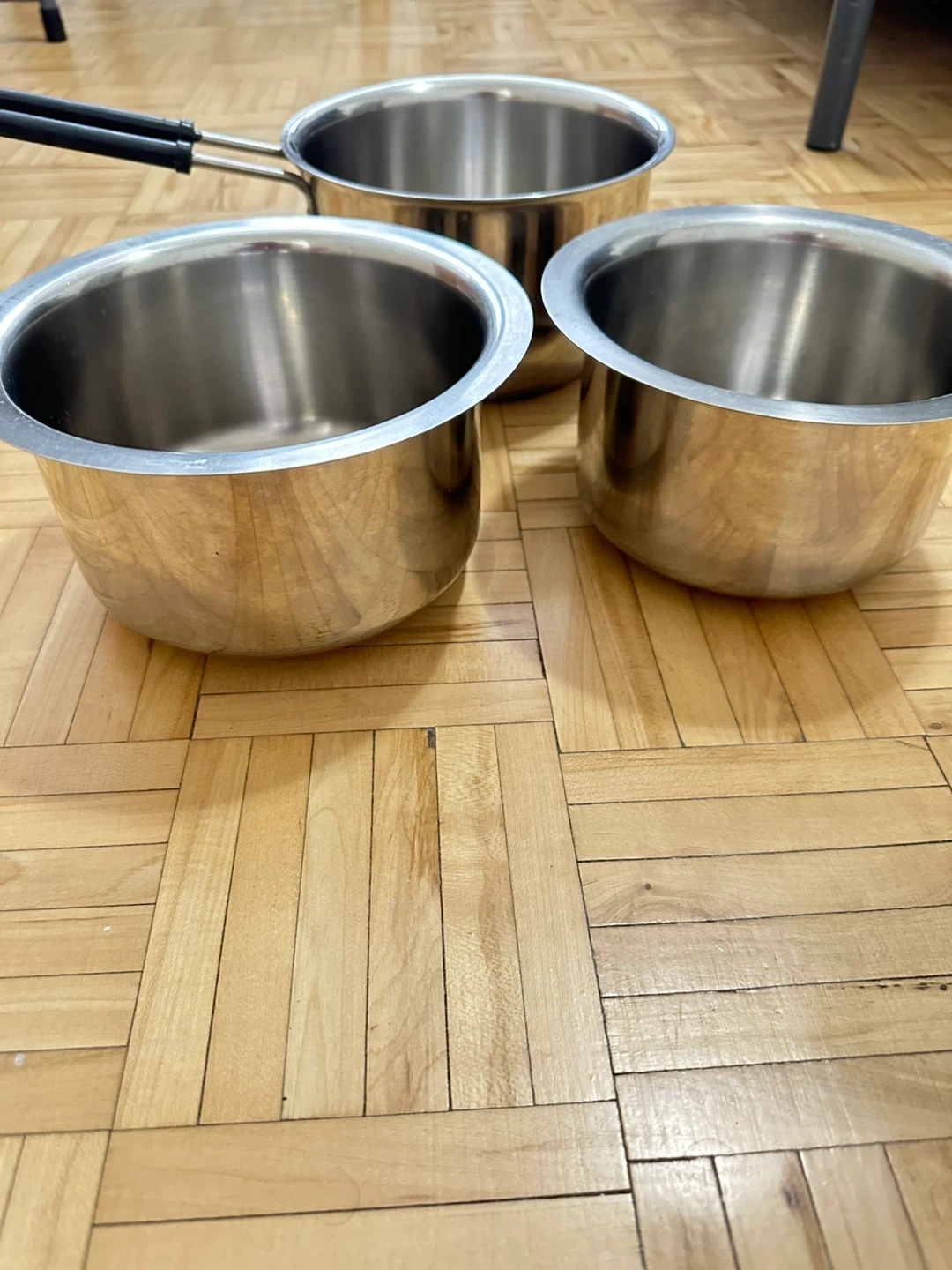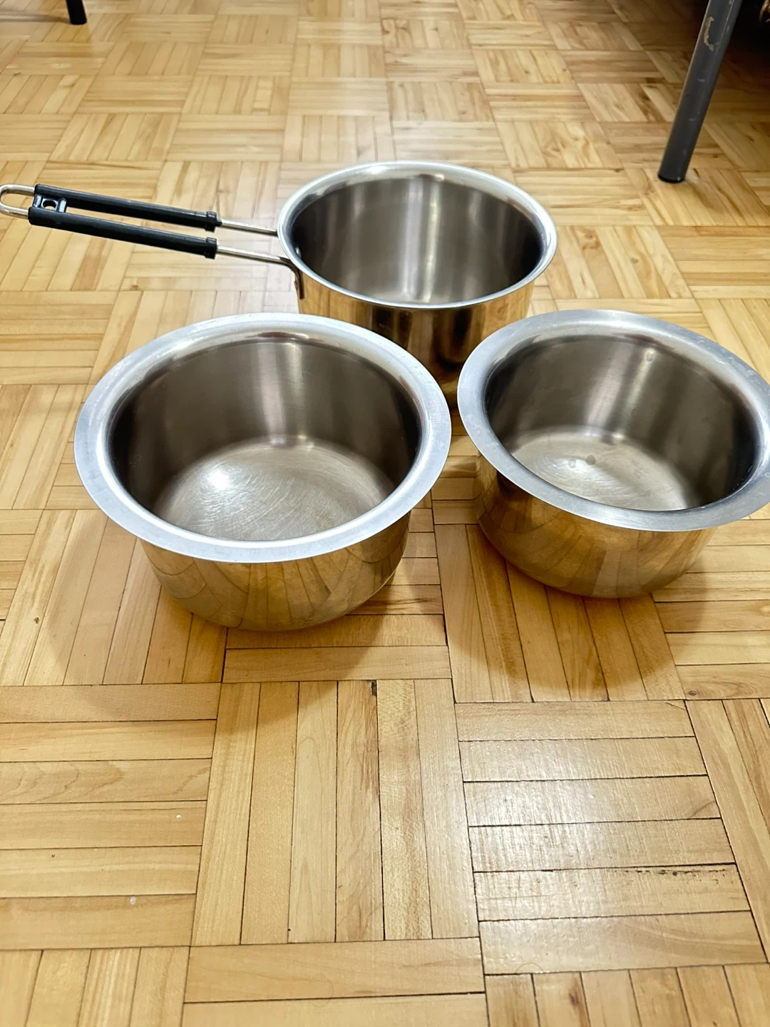 A set of three stainless steel cooking pots. One pot features a long handle with a black grip. These are durable and easy to clean pots. They're great for everyday cooking needs!