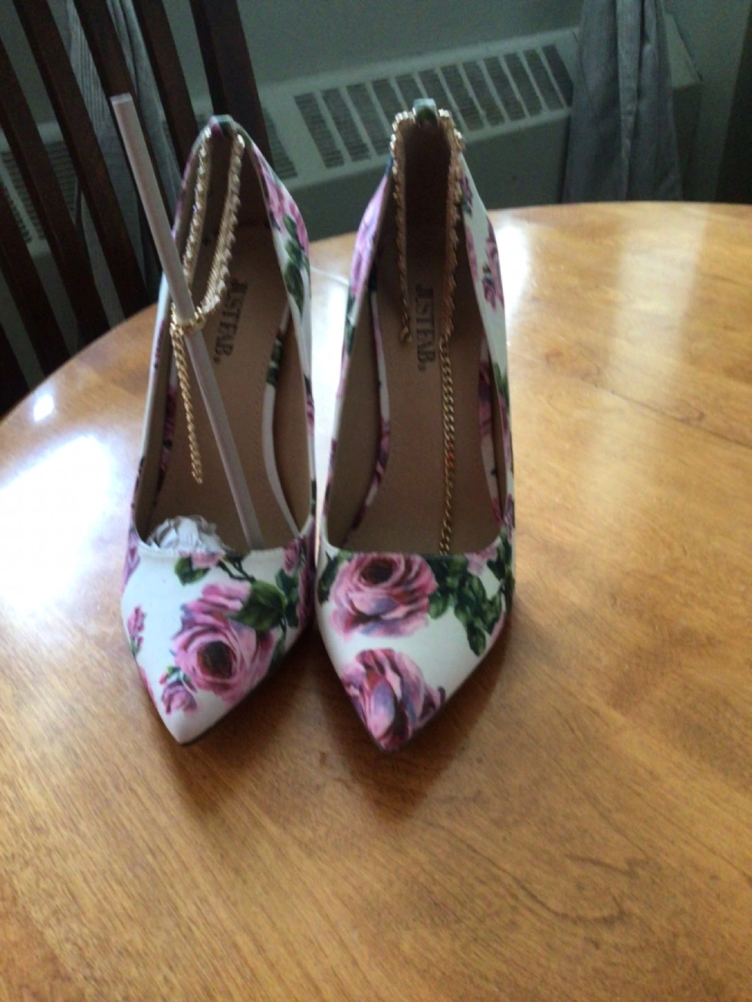 Brand new ladies high heeled shoes. Size 10, but I think they’re 9,5. Never been worn, as they don’t fit me. Bought on line usual size, but they are too tight on me. Justfab brand. Heel about 4”.