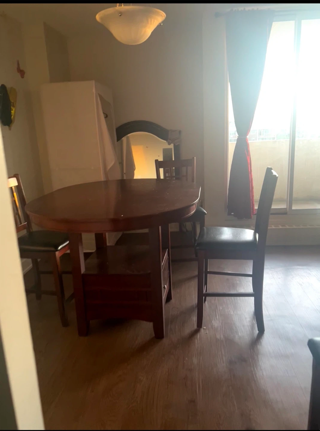 This is a wooden dining table with four matching chairs. The table has a dark wood finish and a shelf underneath. Chairs have black upholstered seats and backrests. It's a nice set for a smaller dining area or kitchen nook!