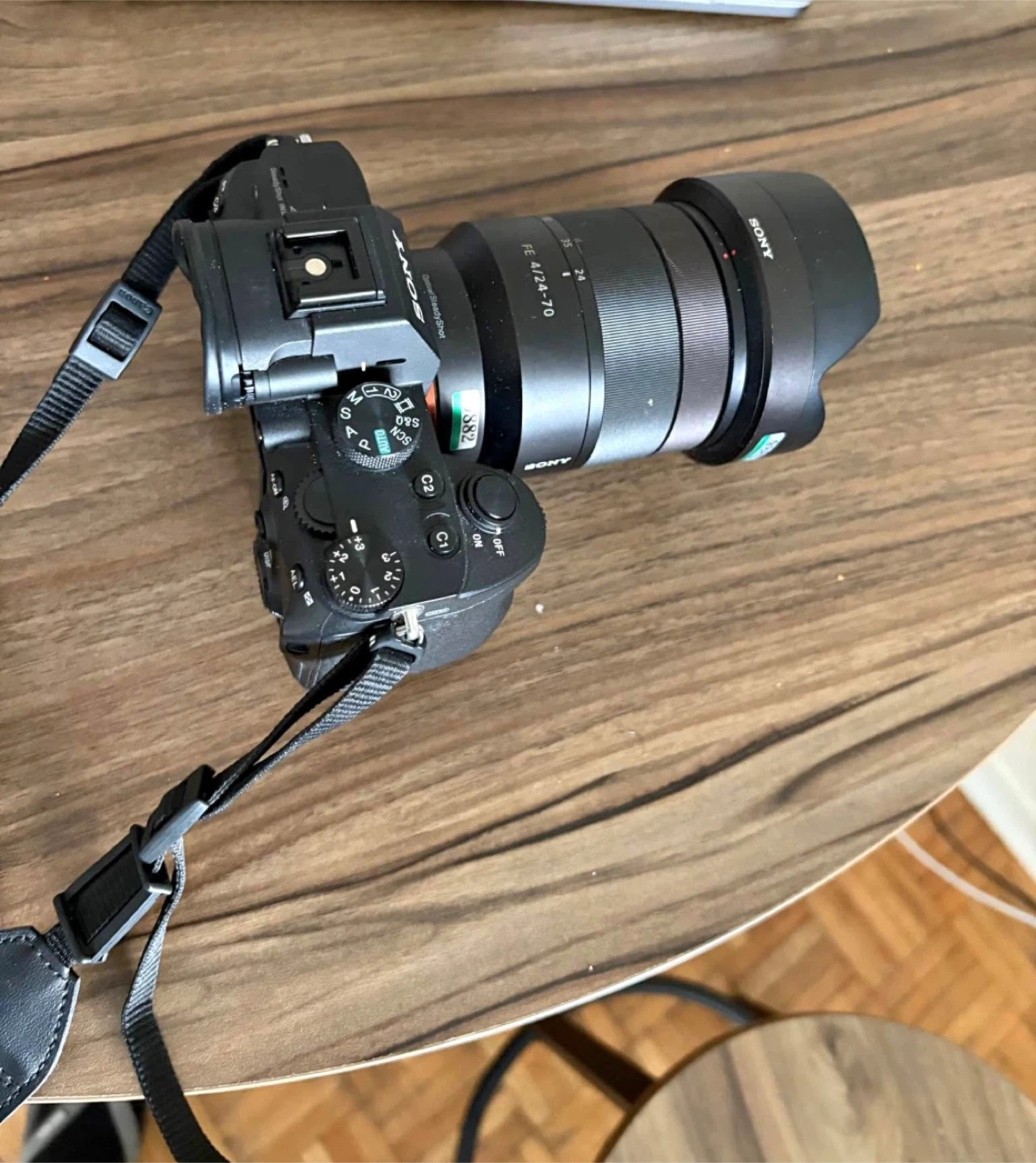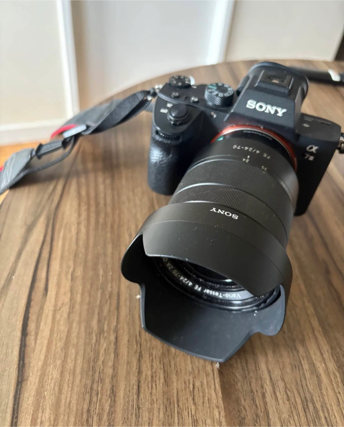 This is a Sony Alpha a7 III mirrorless camera with a FE 24-70mm f/4 lens. It's a full-frame camera known for its excellent image quality and autofocus performance. The lens offers a fast aperture for great low-light shooting and beautiful bokeh. This combo is great for professional photographers and serious hobbyists.