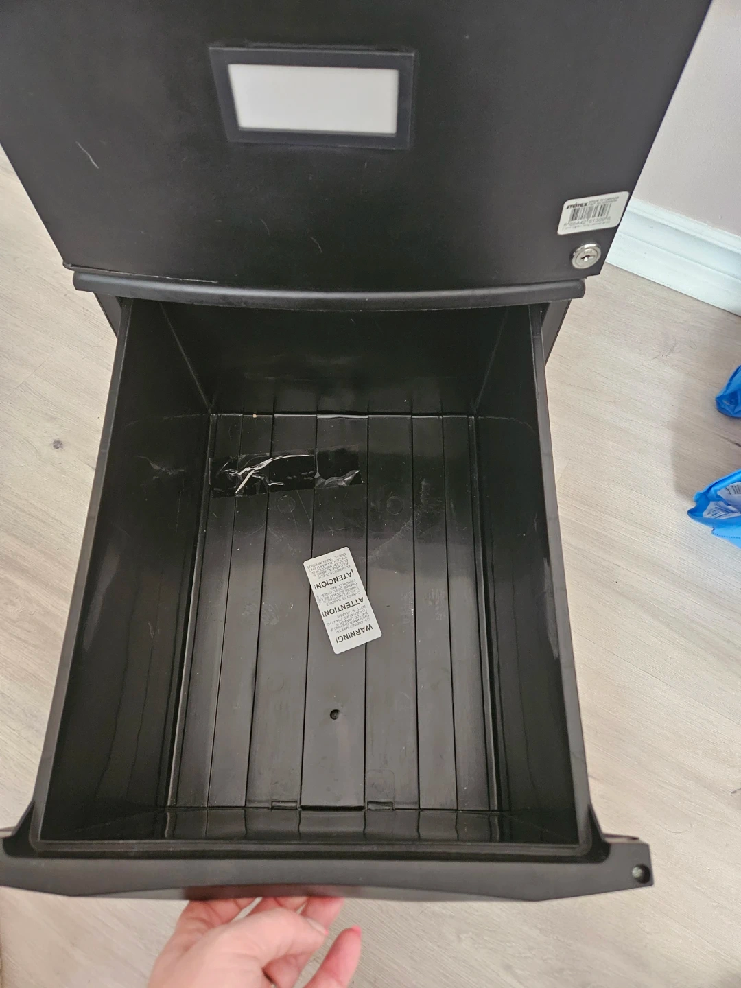 This is a black two-drawer filing cabinet. It's made of durable plastic. The drawers have labels for easy organization. Keys included