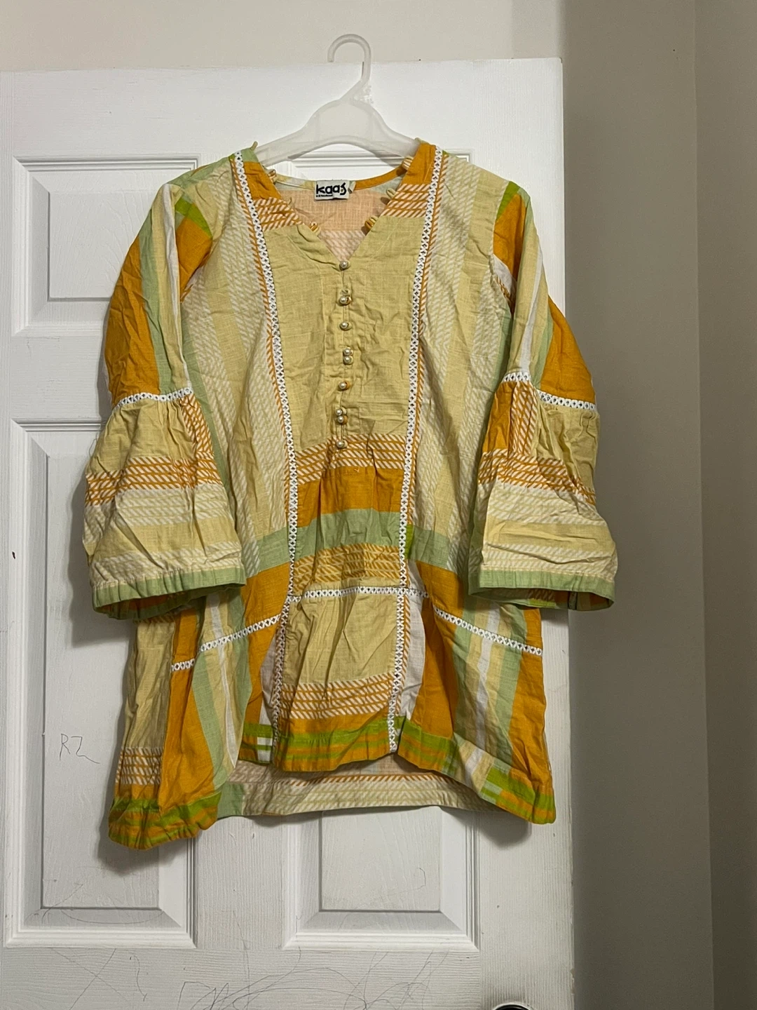 Selling a Kaas by Gul Ahmed tunic in size L. It features a unique pattern with orange, yellow, and green hues. The tunic has decorative white crochet detailing and pearl-like buttons. It's in great condition and ready for a new home!