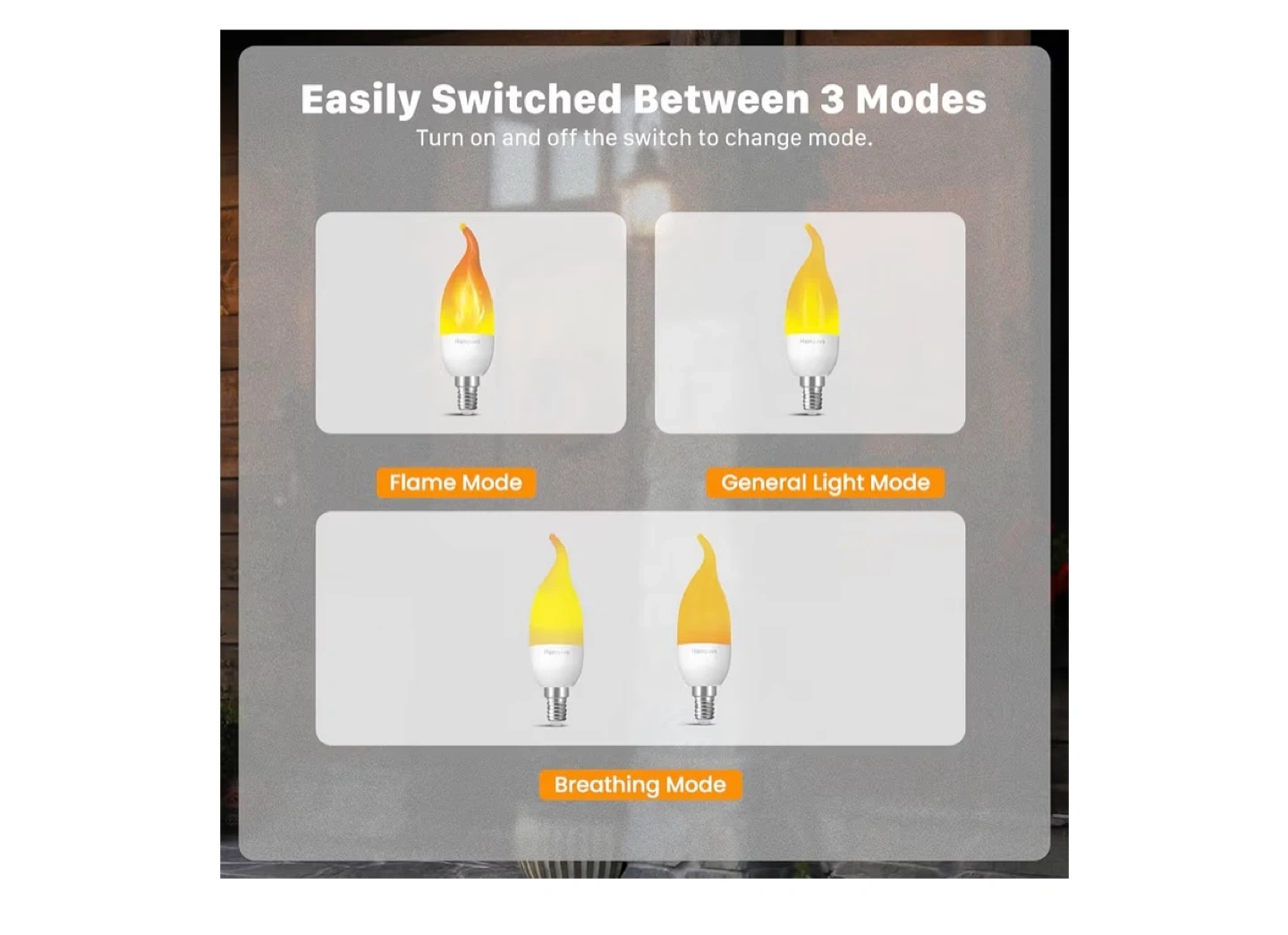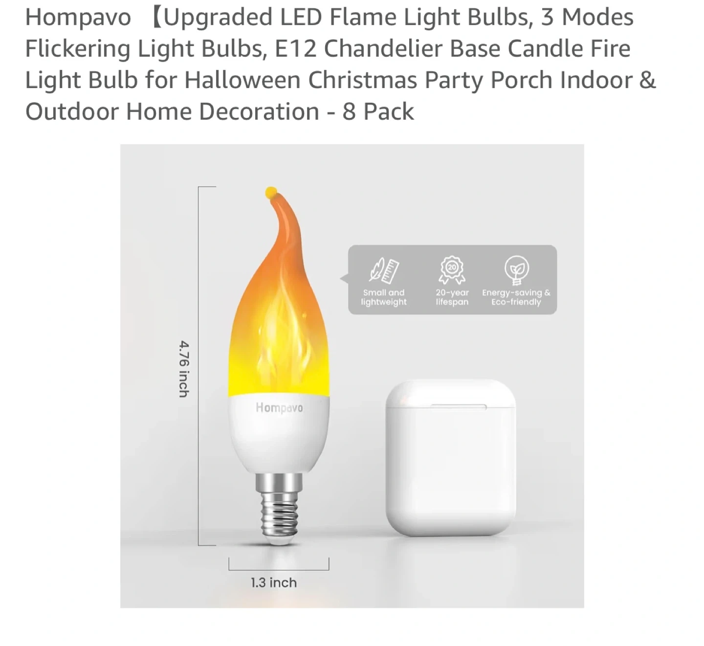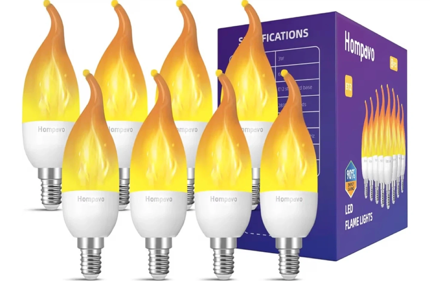 Get a set of eight Hompavo LED flame light bulbs with an E12 chandelier base. These bulbs feature a realistic flickering flame effect and are energy-saving. They're great for adding ambiance to Halloween, Christmas parties, porches, or patios with 3 settings