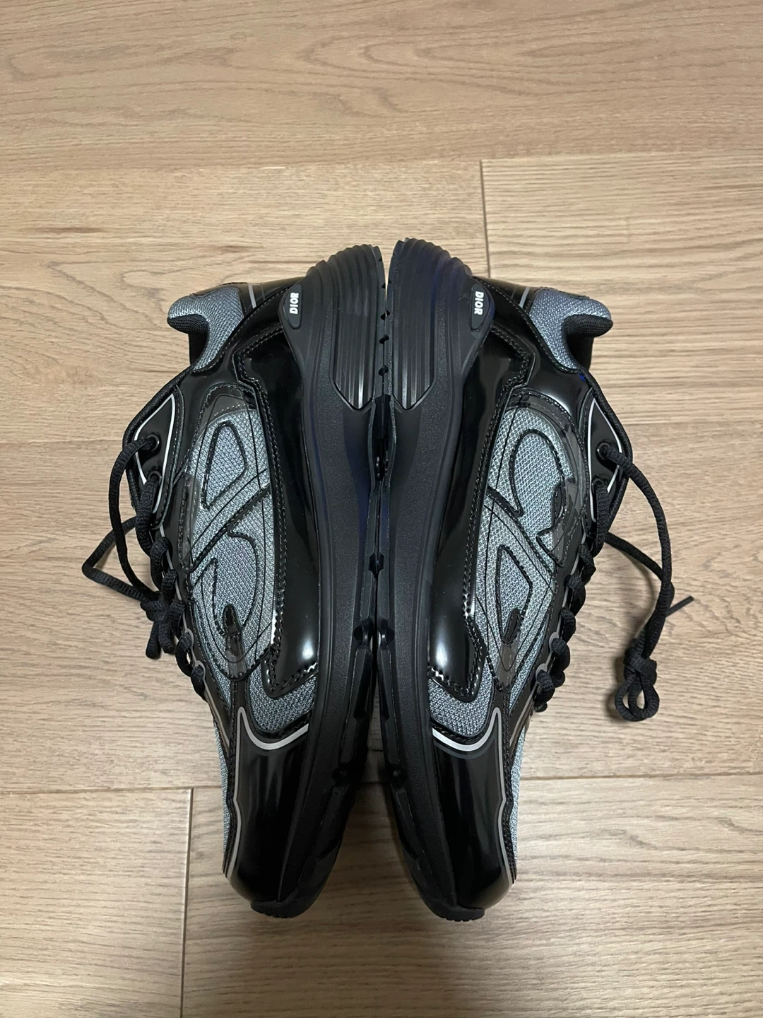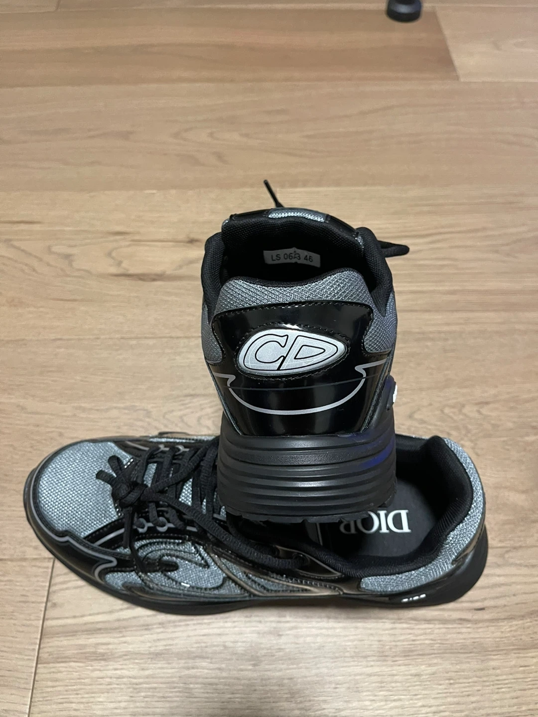 Dior B30 sneakers in black and grey. Features a CD logo on the heel tab and a lace-up closure. Made with leather and technical fabric. Size 46 fits 45-44