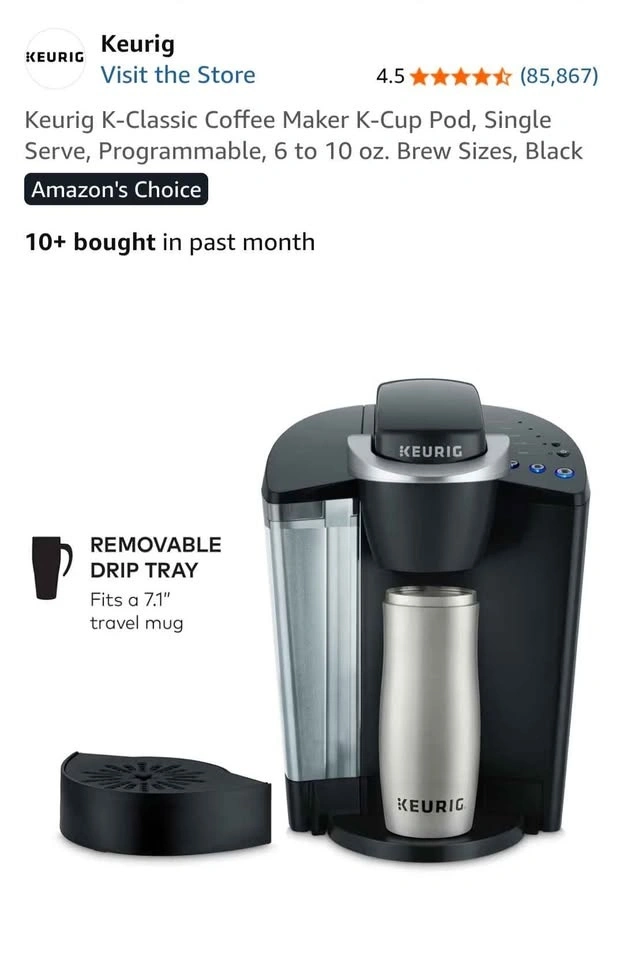 Programmable Keurig K-Classic coffee maker. Single serve K-Cup pod brewer. Has 6 to 10 oz brew sizes. Removable drip tray fits travel mugs. Has a 48 oz removable water reservoir. Dimensions are 13.3" high (17.6" when open), 10.1" wide, 13.2" deep. Used only once but needed more counter space. Includes filter holder. Pick up in Niagara Falls.