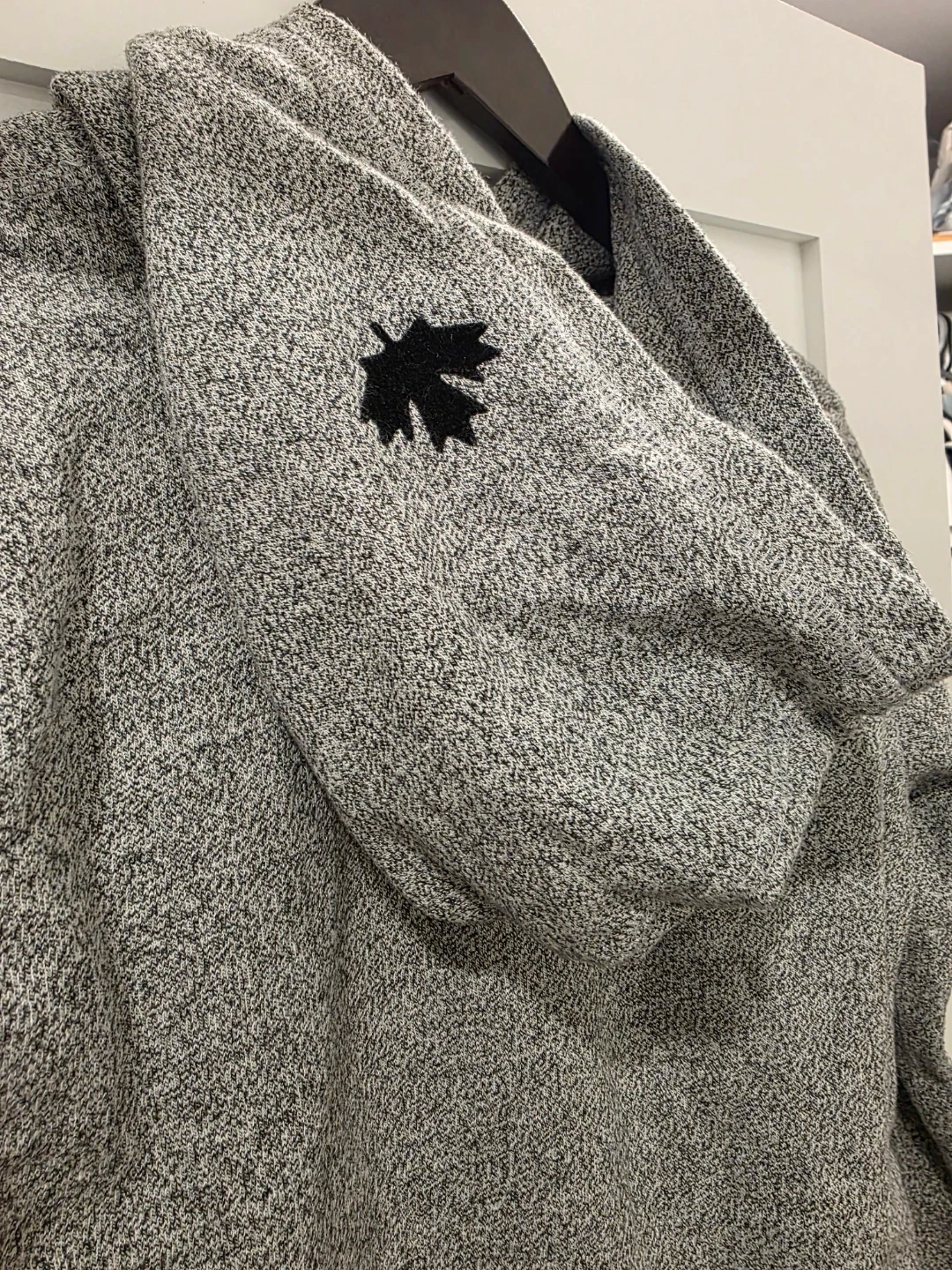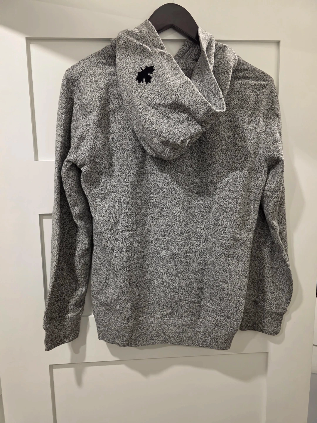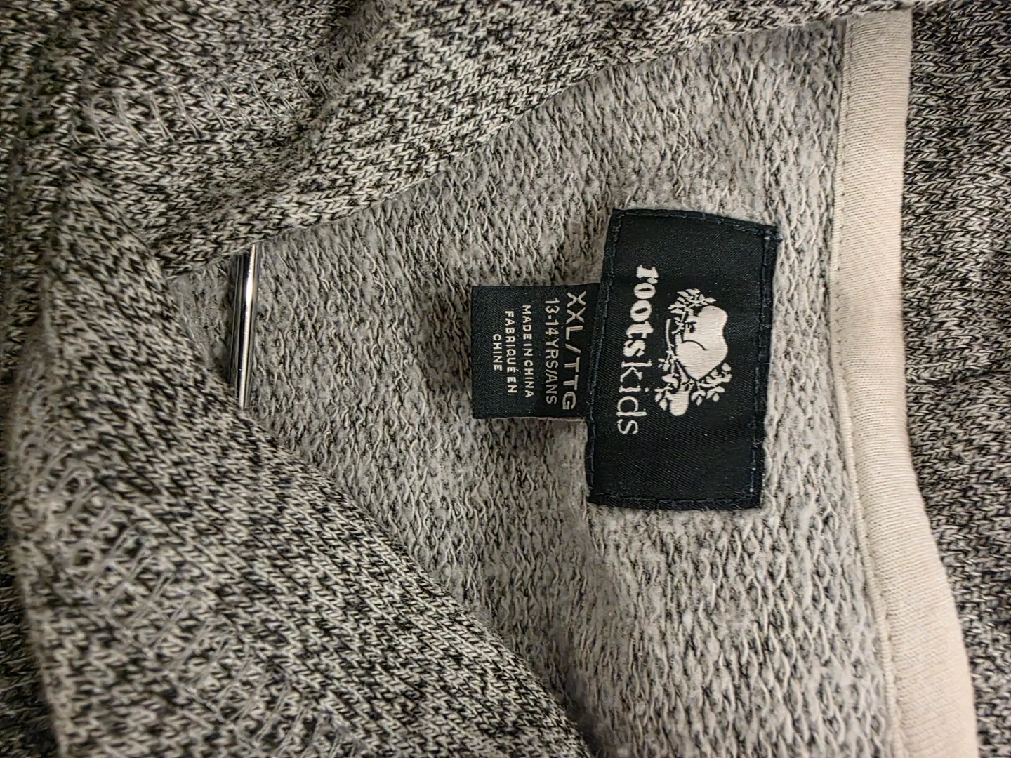 This Roots kids hoodie is size XX-Large (13-14 Yrs). It's grey with the classic Roots beaver logo and a small maple leaf detail. Made in China.