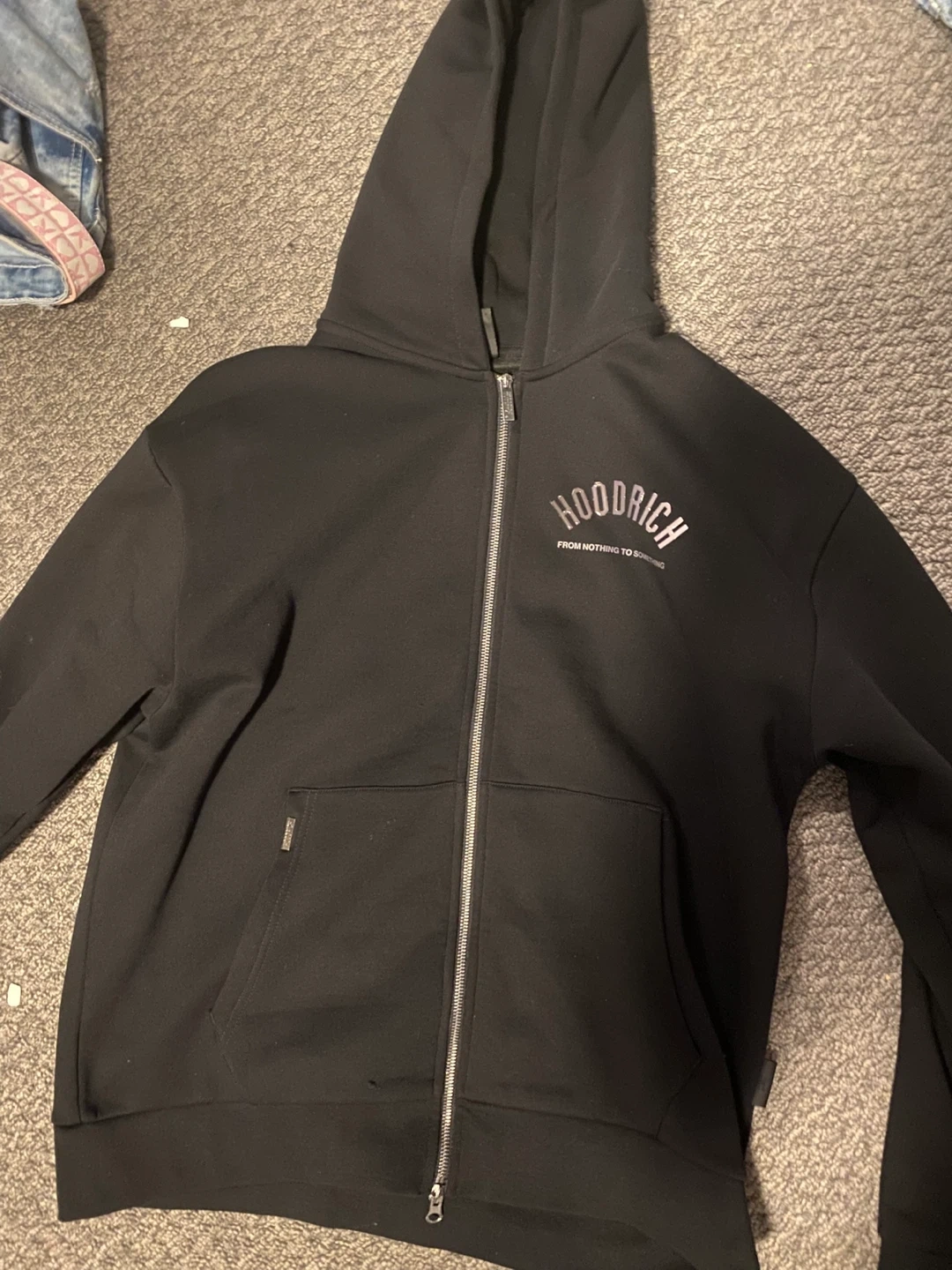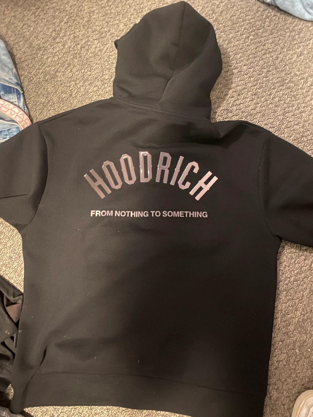This is a black Hoodrich zip-up hoodie with "FROM NOTHING TO SOMETHING" on the back. It's a comfortable and stylish piece for everyday wear. The zipper closure and hood make it practical for changing weather. It's a great addition to any casual wardrobe!