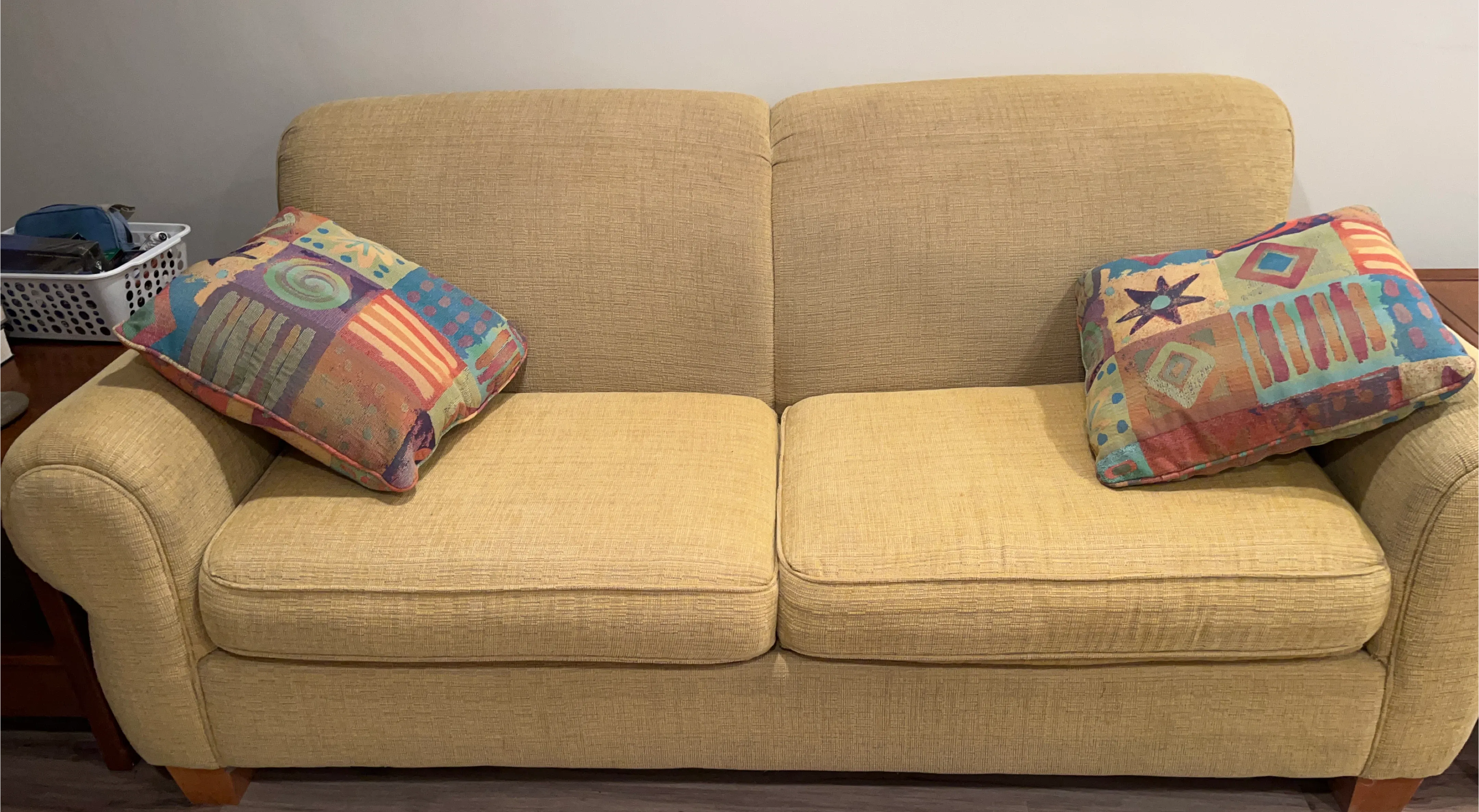 Two-seater yellow sofa with a textured fabric. It comes with two decorative throw pillows featuring a colourful, abstract pattern. The sofa has wooden legs.