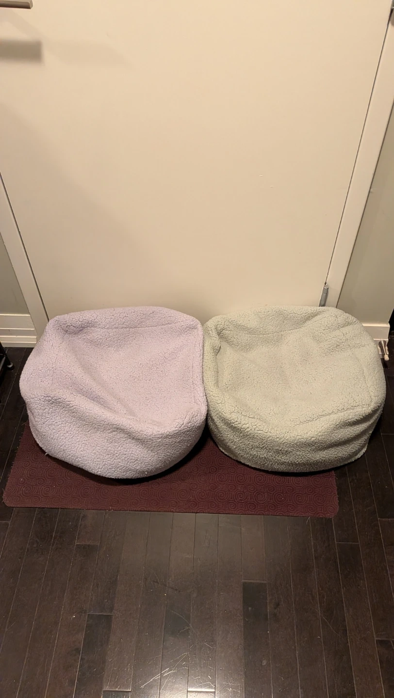 Two cozy, round poufs in a sherpa-style material. One is a light purple, and the other is a soft mint green. They're perfect for extra seating or as footrests.