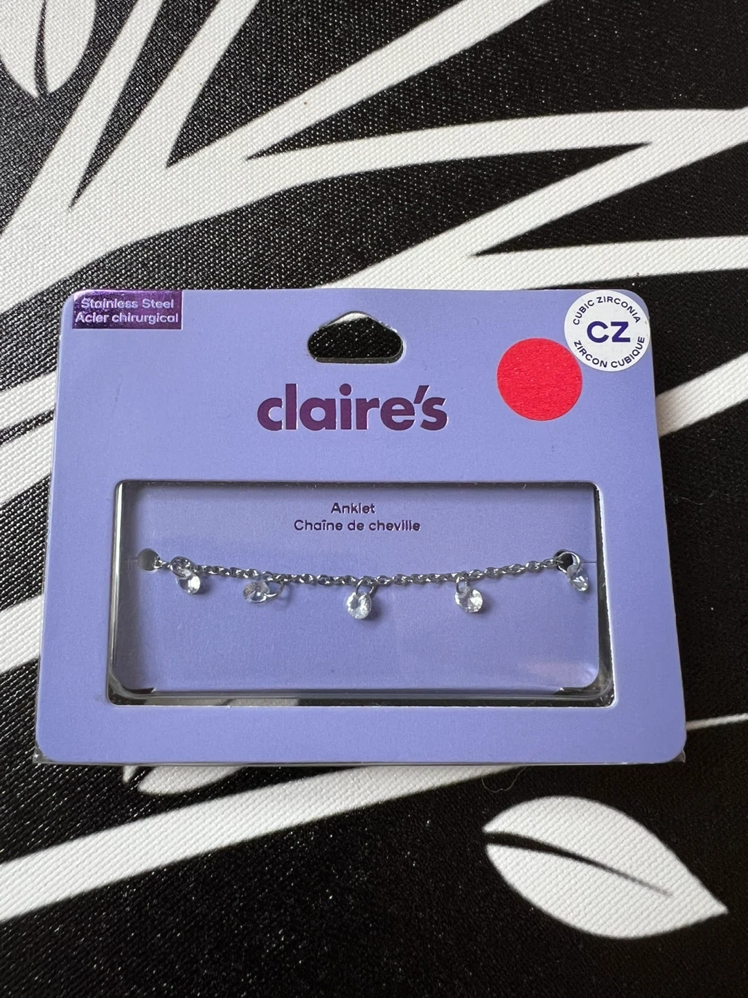 This Claire's anklet is made from stainless steel and features cubic zirconia stones. It's designed to be worn around the ankle. Perfect for adding a bit of sparkle to your outfit!