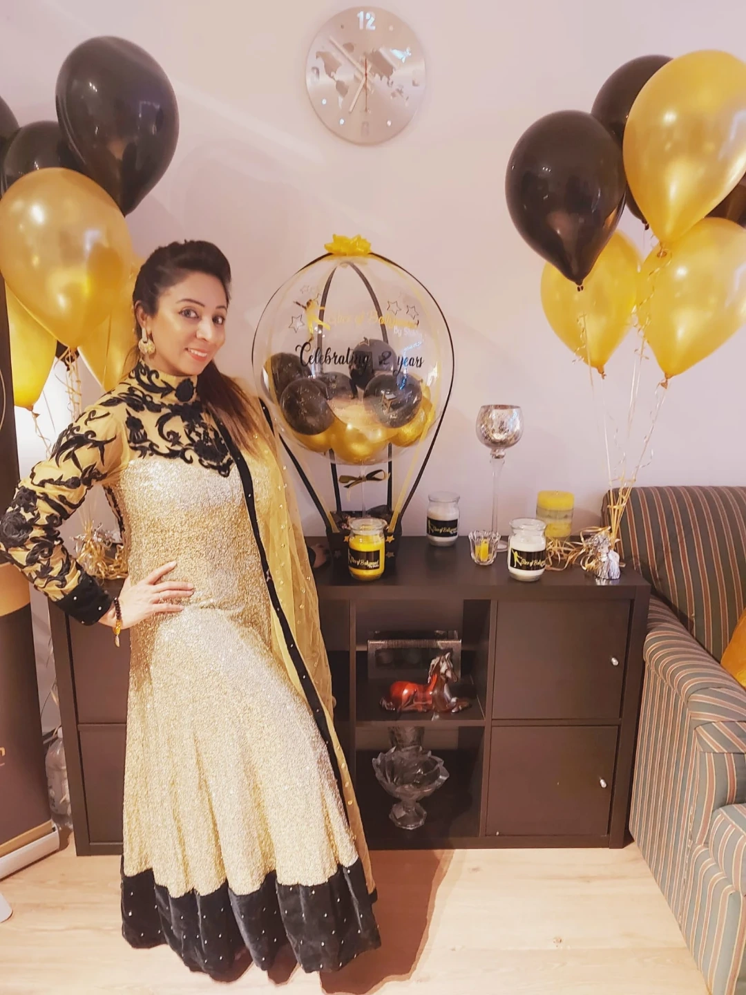 A stunning 1-piece Indian Anarkali gown in black and gold, designed and handcrafted in my own boutique in Delhi. The gown features delicate sequins all over, velvet borders adorned with sparkling stones, and intricate cutwork on the neck, sleeves, and back, creating a luxurious and elegant look.