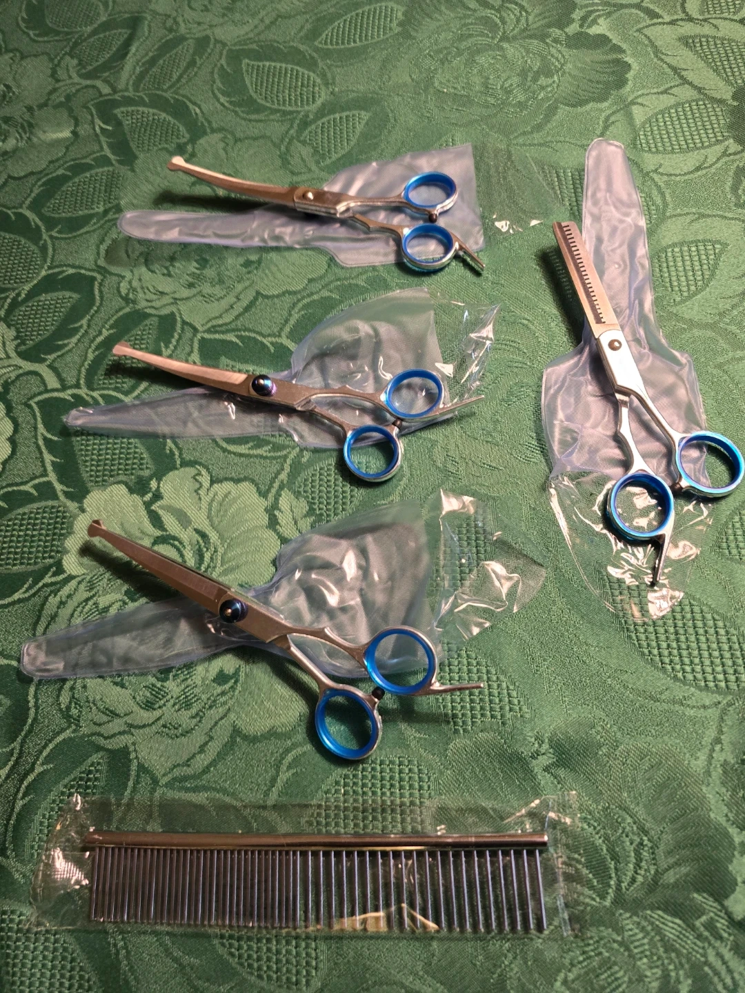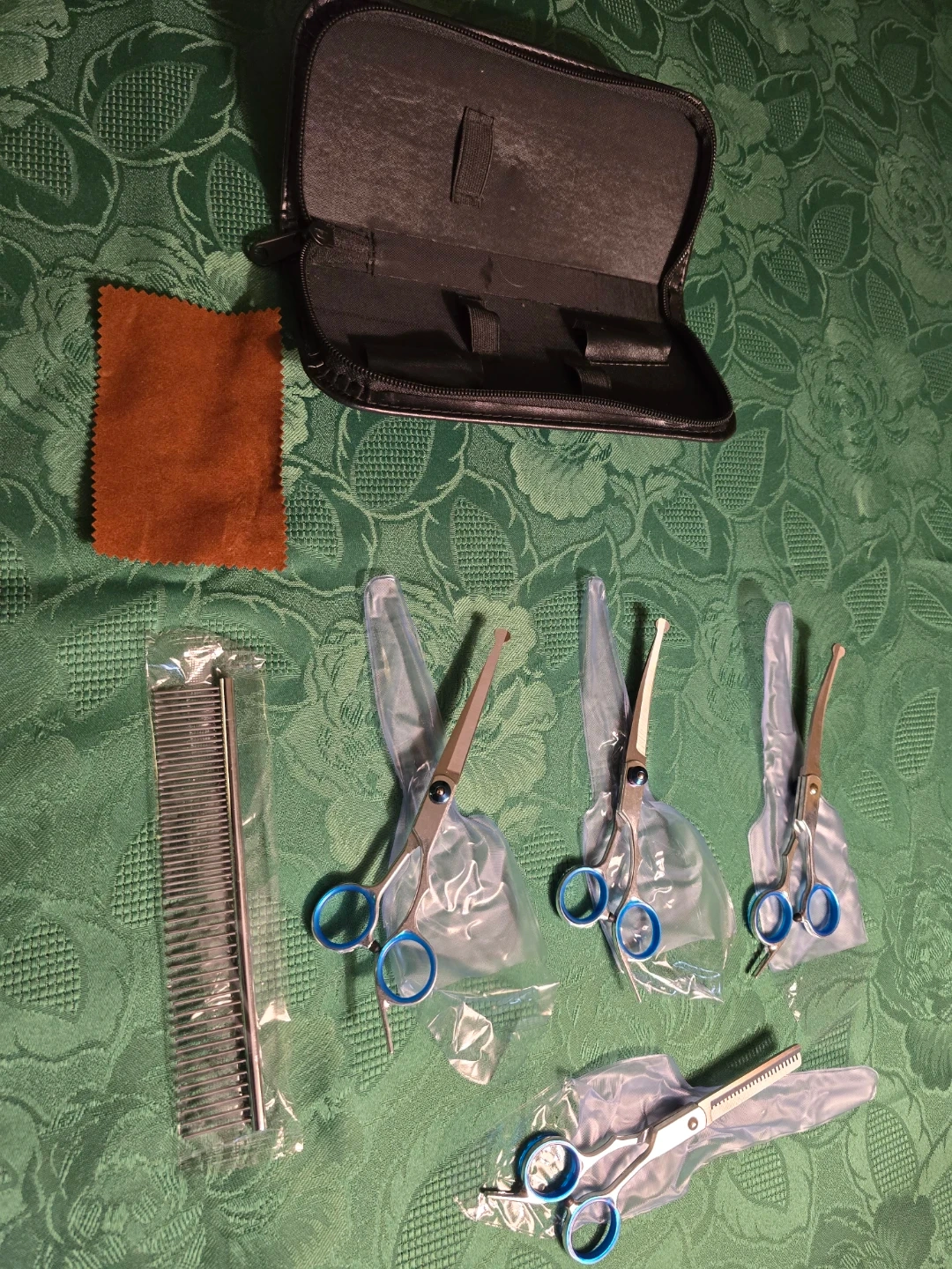 This is a set of 4 hair cutting scissors plus a comb and a cleaning cloth. All items come in a black zippered carrying case. It's useful for dog home or professional dog grooming use.