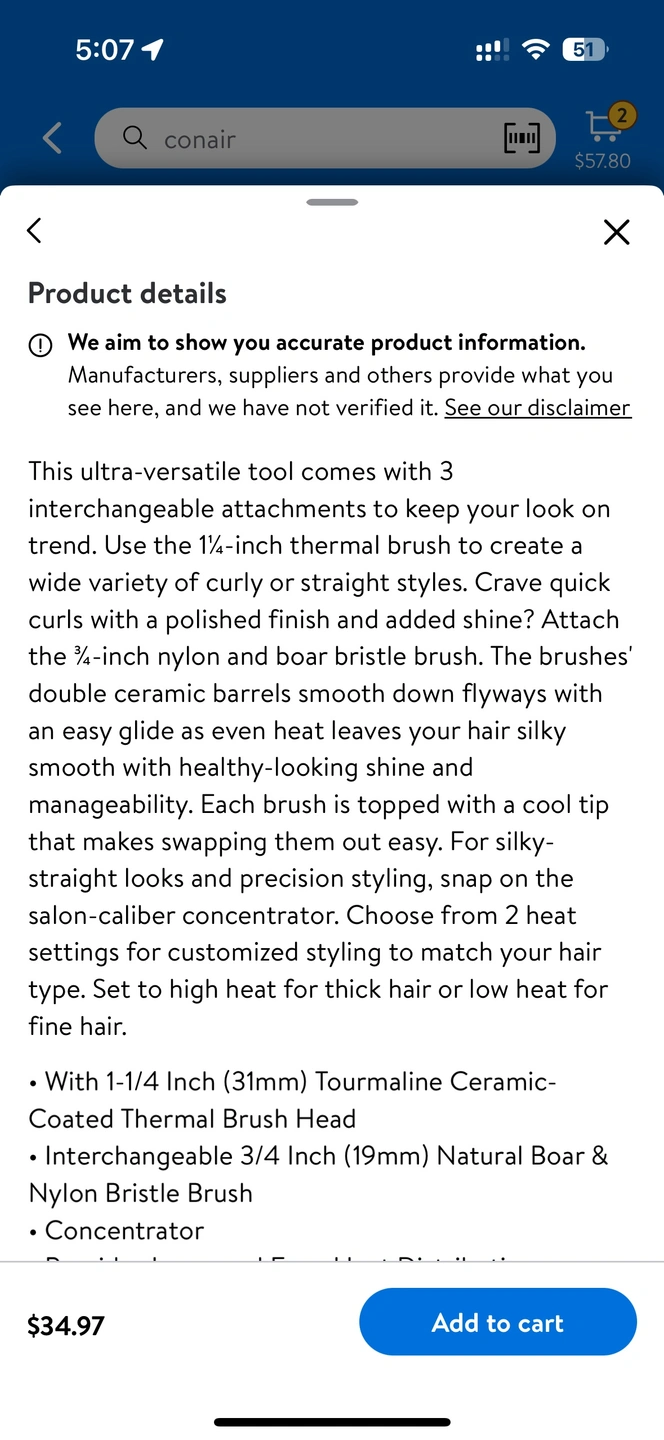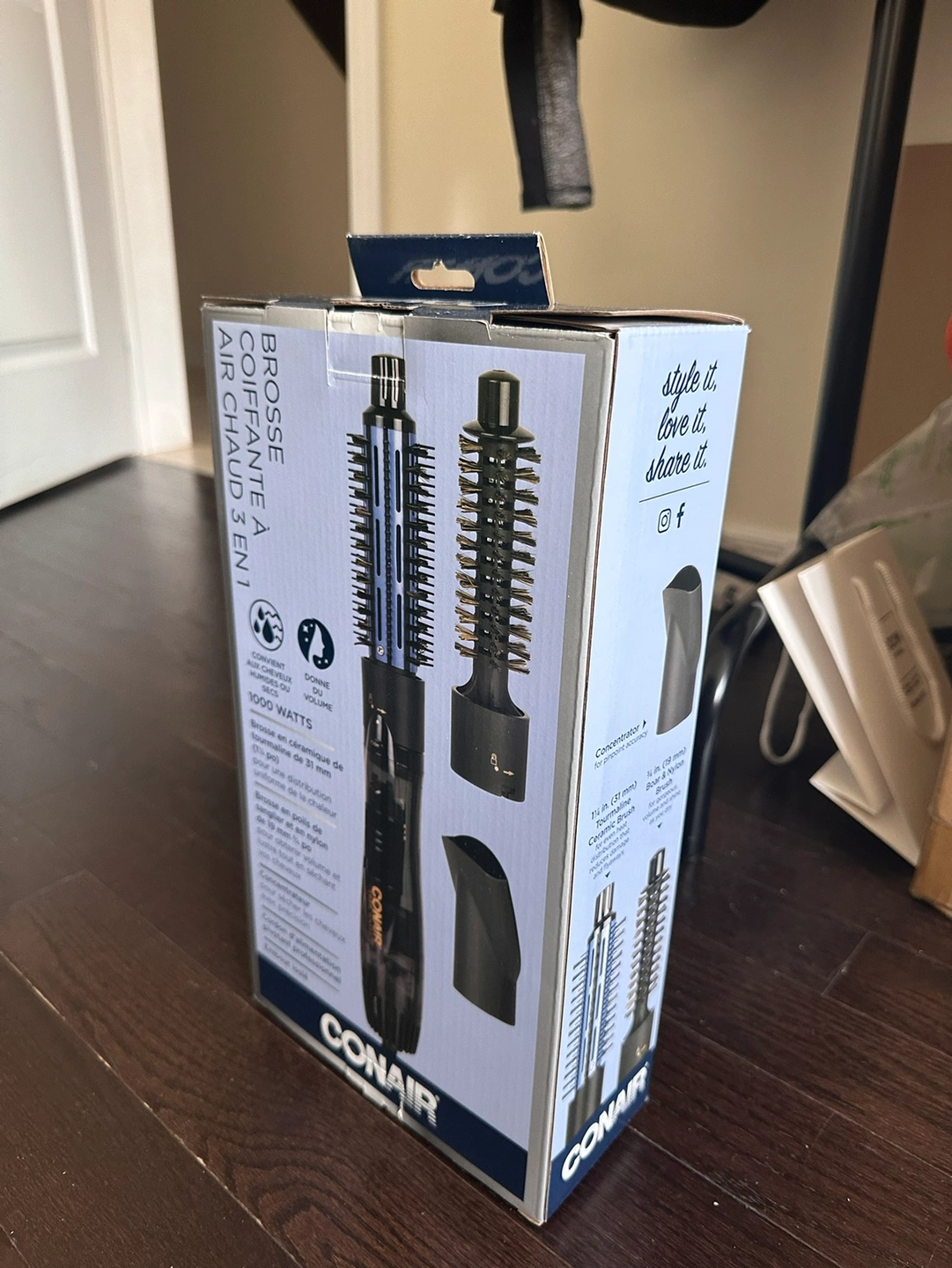 Conair hot air brush with three attachments. Comes in the original box. Just bought a few month, my hair is so thin and not suit for me. Just use 2 times.