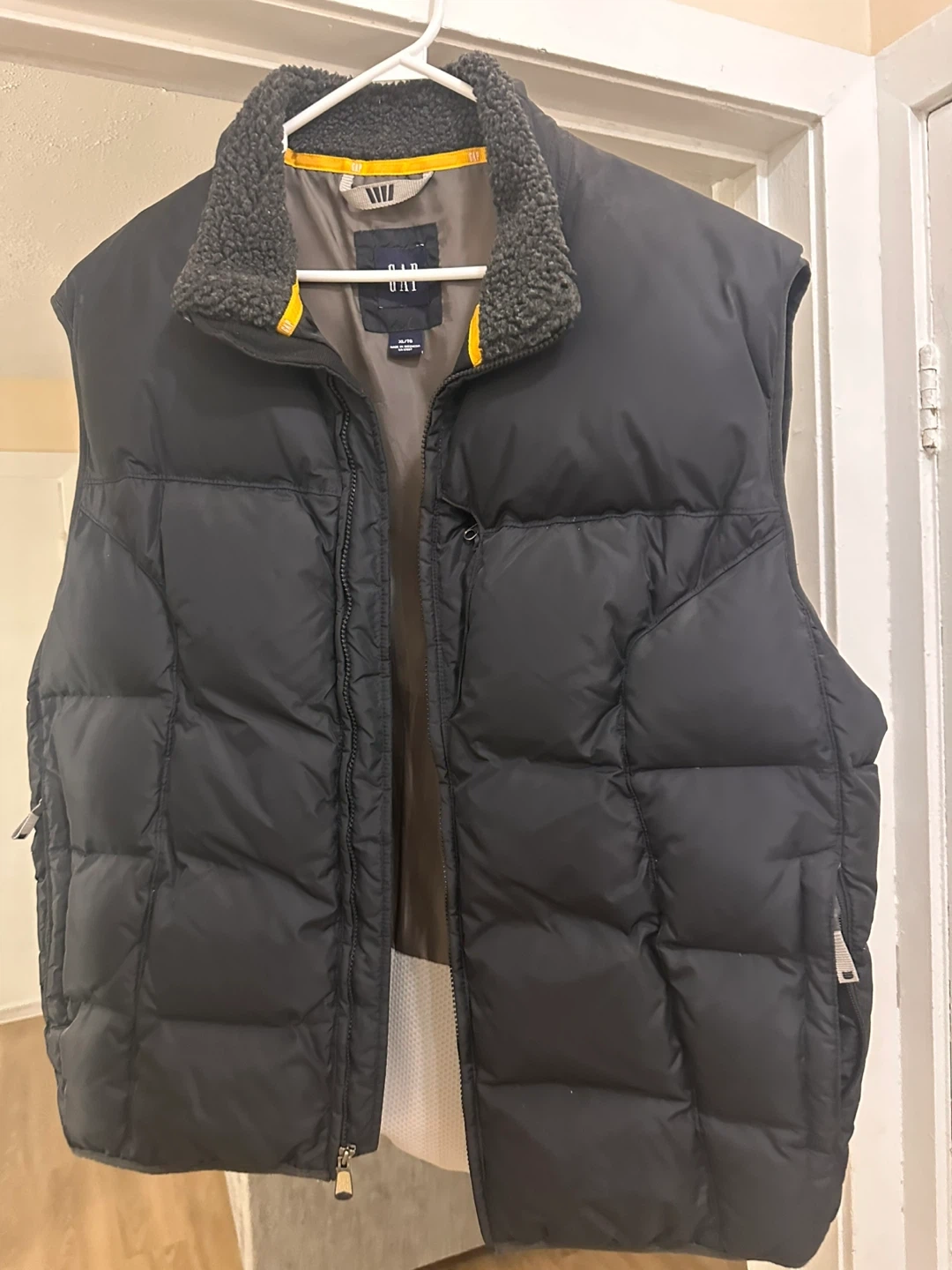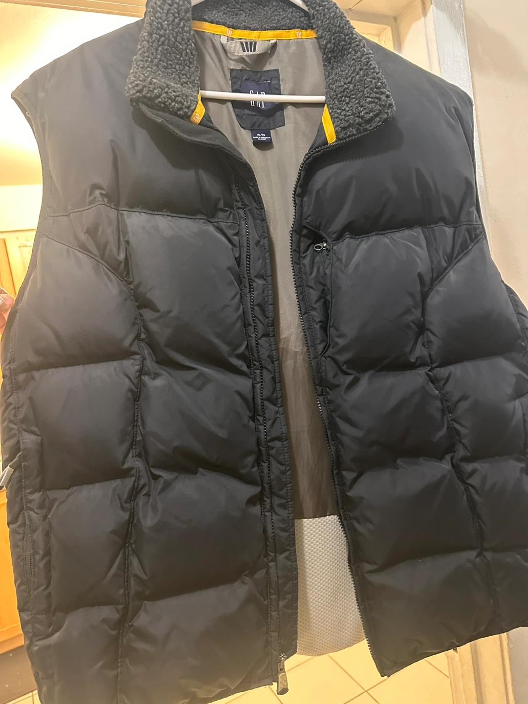Cozy Gap puffer vest in black, perfect for layering! It's a size XL and in great condition. The vest features a soft, textured collar and a full zip closure. Great for adding warmth without the sleeves!