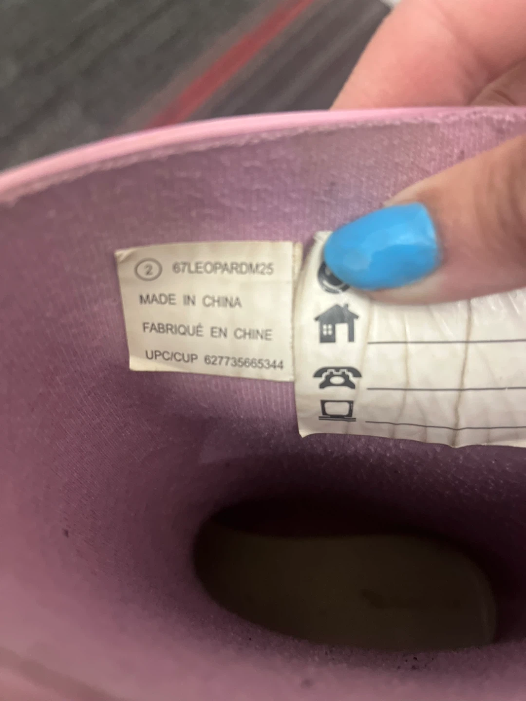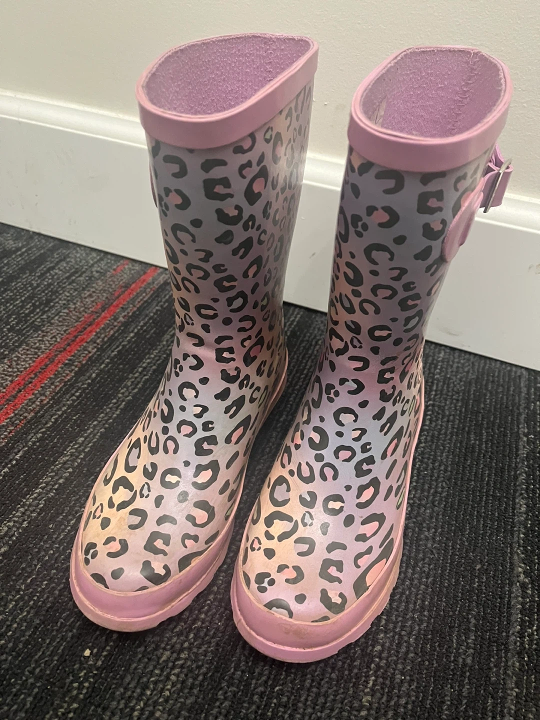 Size 2 . These kid's rubber rain boots feature a fun pink and grey leopard print. They have a pull-on style with a buckle accent on the side. The soles are made of rubber for good grip. They're perfect for splashing in puddles!