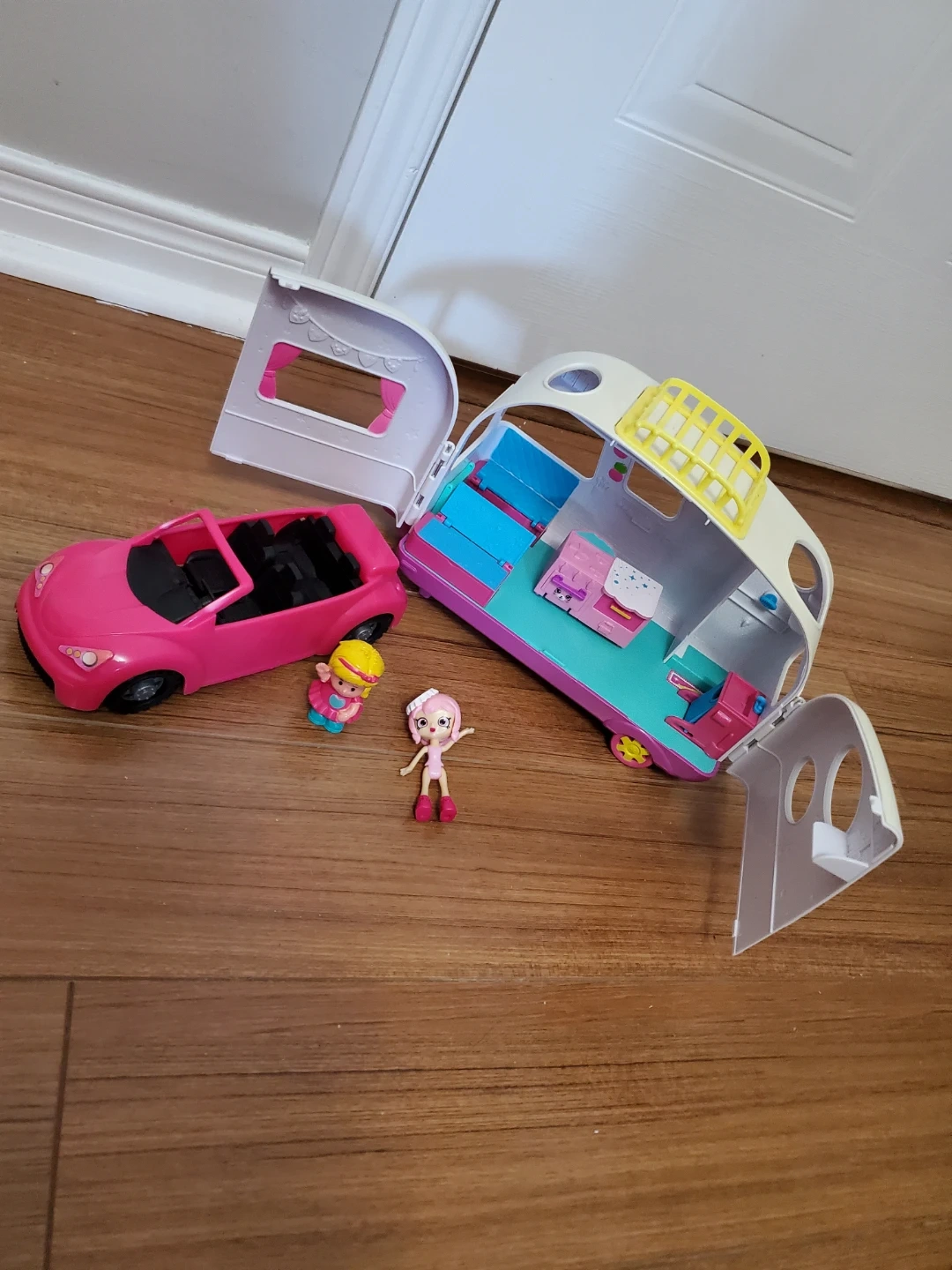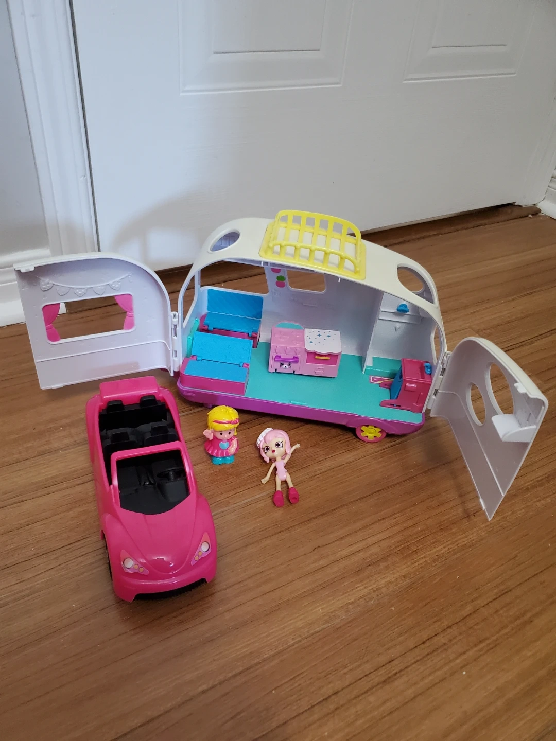 This Happy Places playset includes a camper that opens up and a pink convertible car. It comes with two cute figures and mini accessories inside the camper. Great for imaginative play!