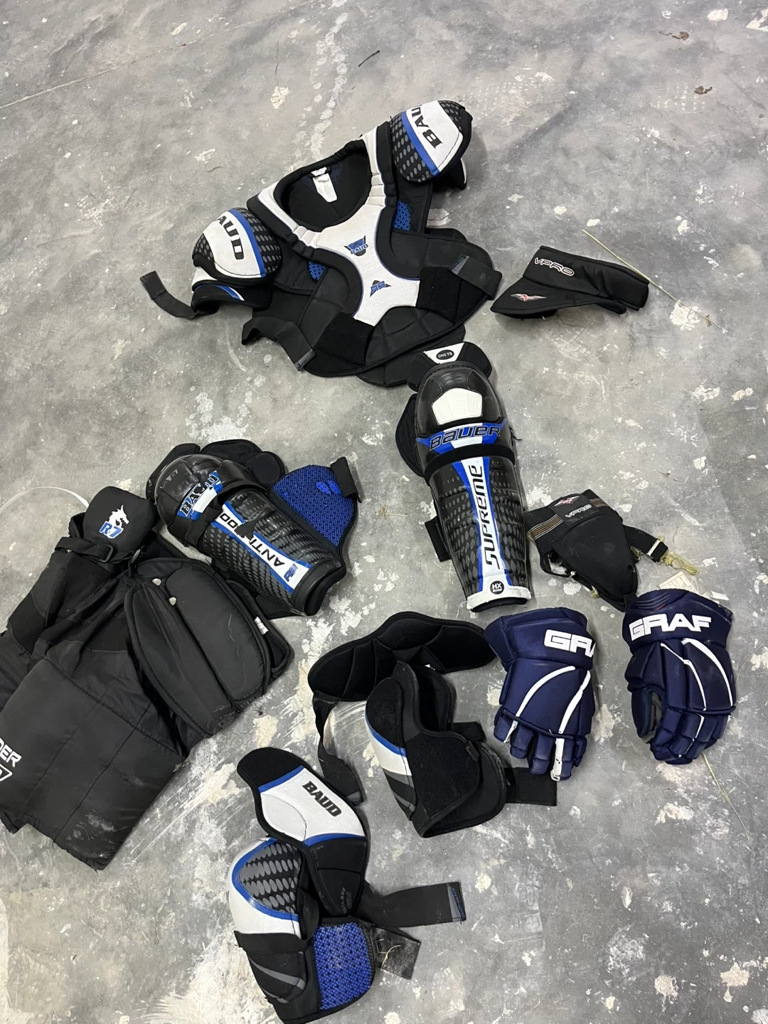 Selling a bundle of used hockey gear! It includes a Bauer Supreme shin guards, Graf gloves, a VPro visor, and other protective equipment. Great for anyone looking to get started or upgrade their gear