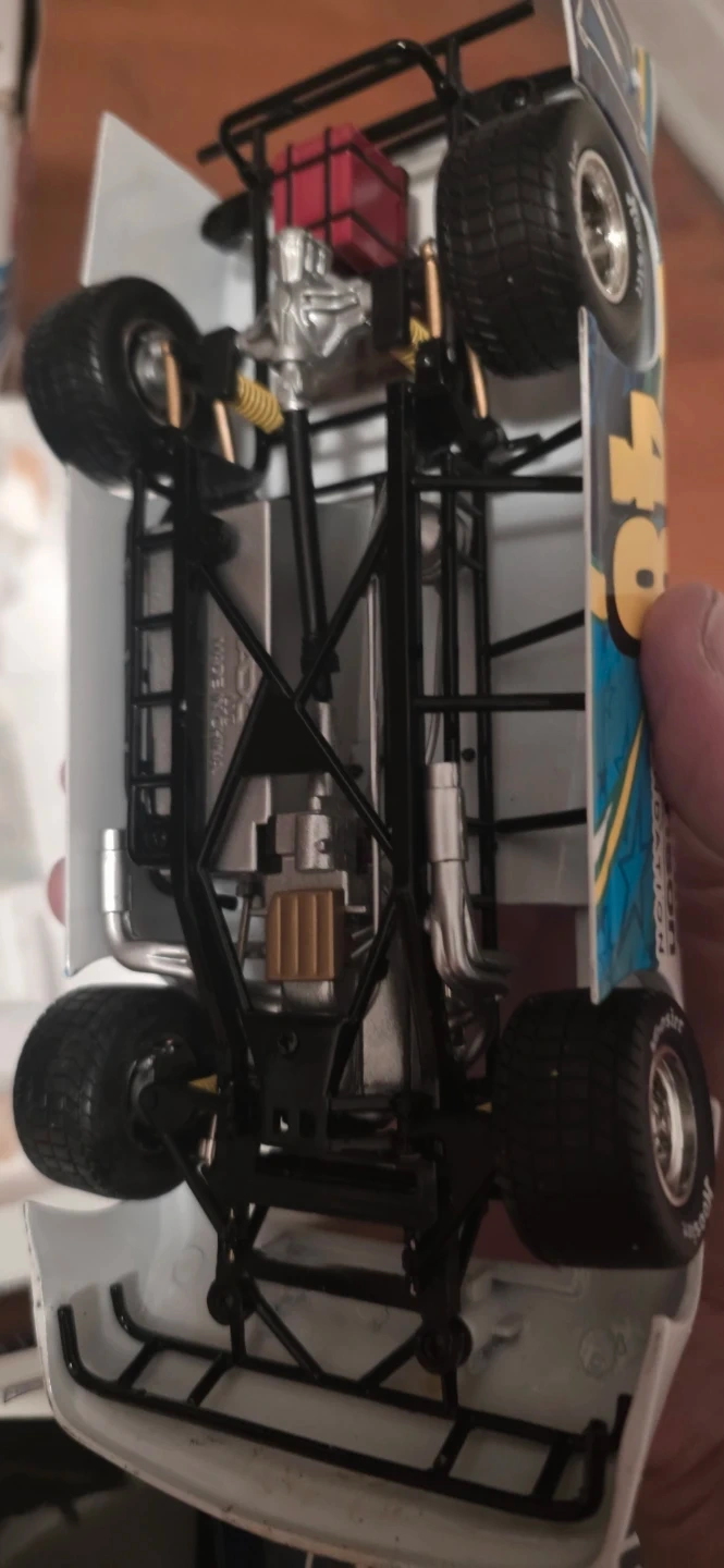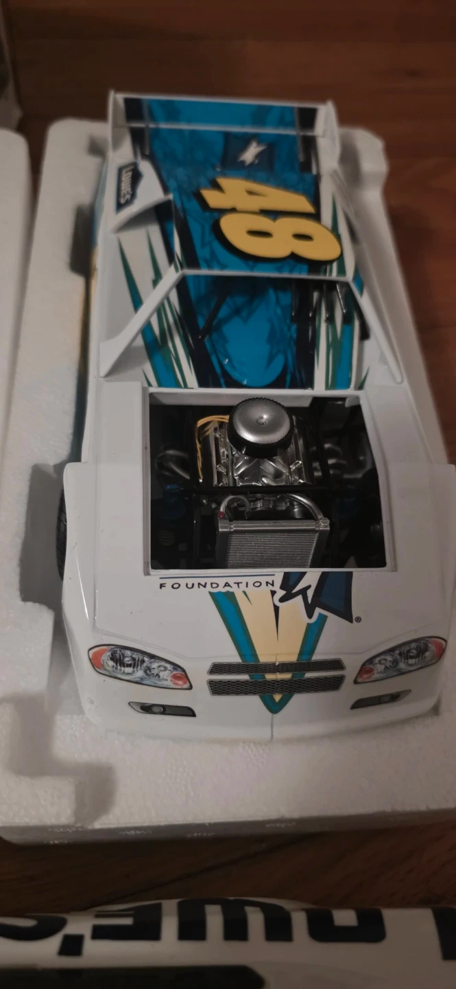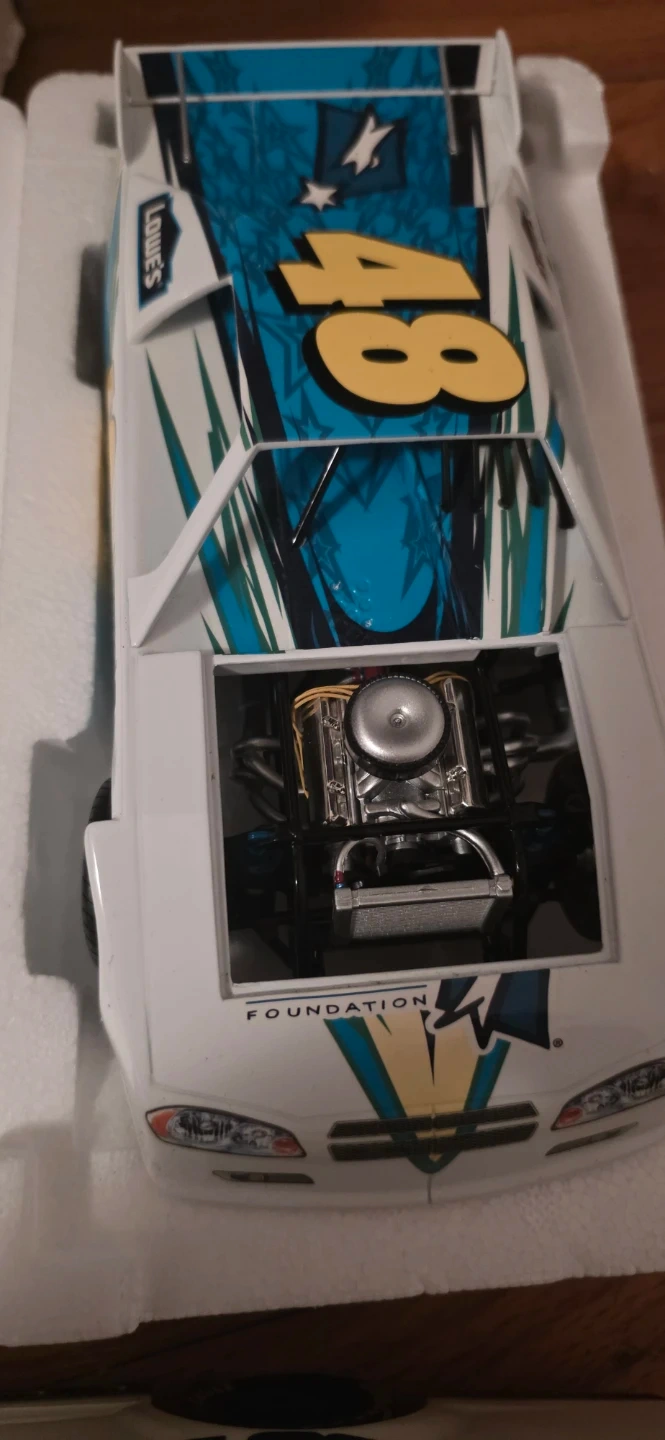 This is a 1:24 scale diecast model of the #48 Lowe's car driven by Jimmie Johnson. It features detailed engine and chassis components. The car comes with its original packaging and display box, which includes Jimmie Johnson's signature. Box has some wear