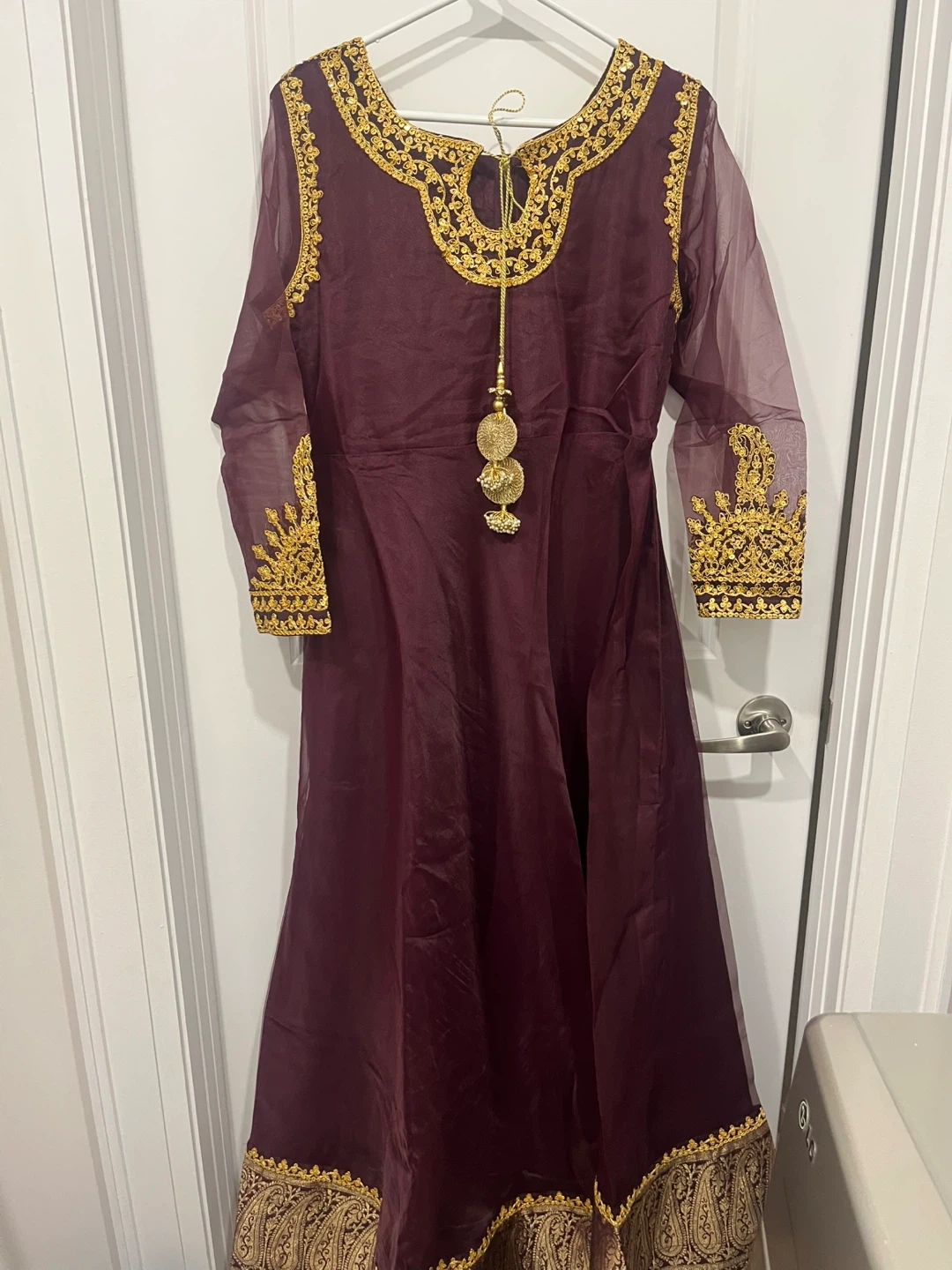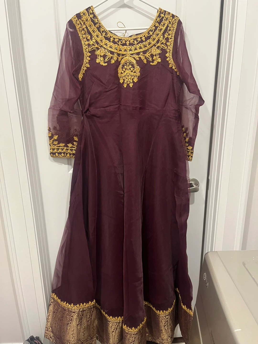 Purple Anarkali dress with intricate gold embroidery on the neckline, sleeves, and hem by Asim jofa . Sheer sleeves add an elegant touch. This dress is perfect for festive occasions and cultural events. It's designed for a flowing, comfortable fit. Fits a size small